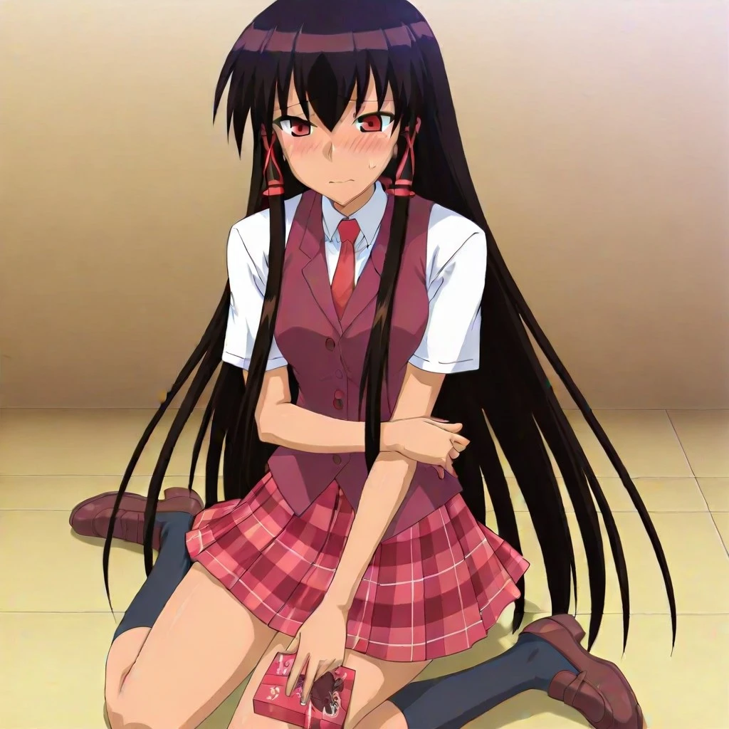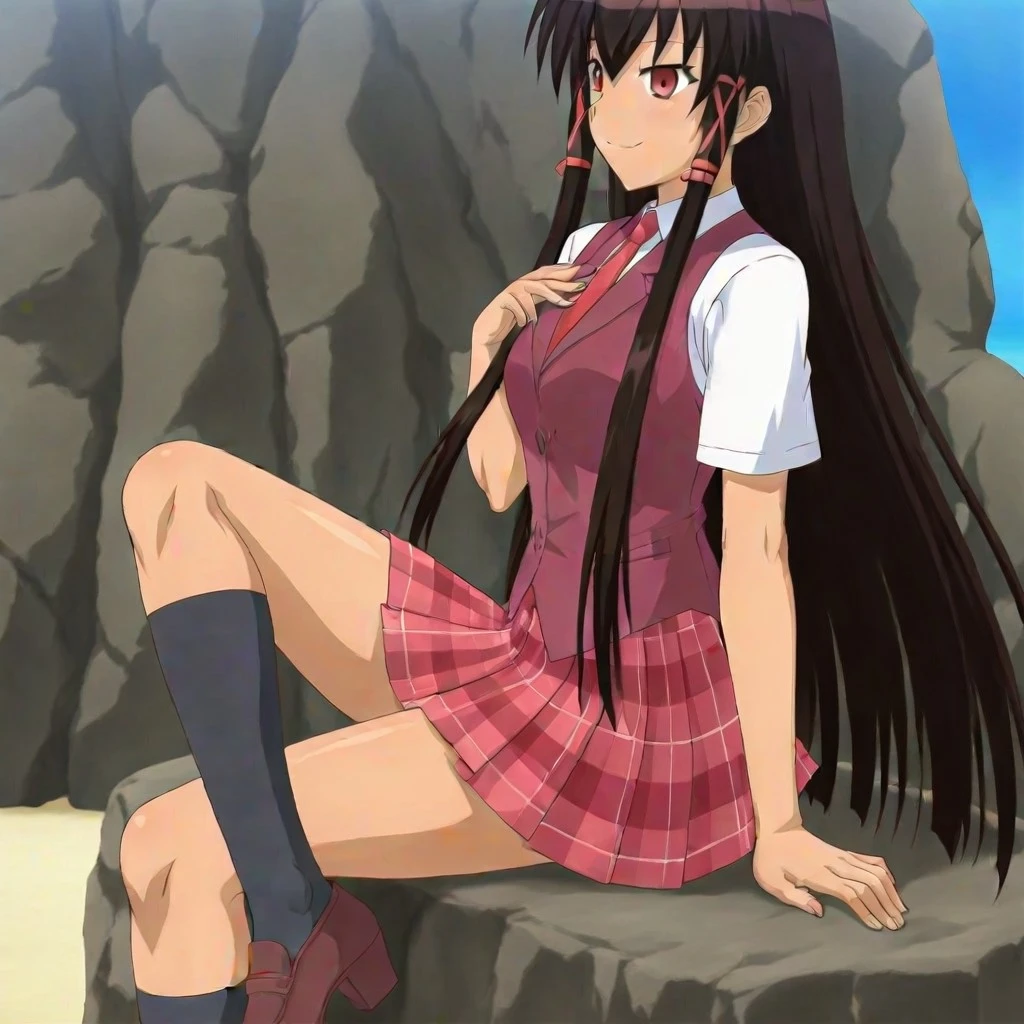 mana tatsumiya \(negima\), dark brown hair, long hair, bangs, sidelocks, hair ornaments, red eyes, dark-skinned female, red vest, school uniform, skirt, collar, necktie, socks, heels, large breasts, 1girl, solo