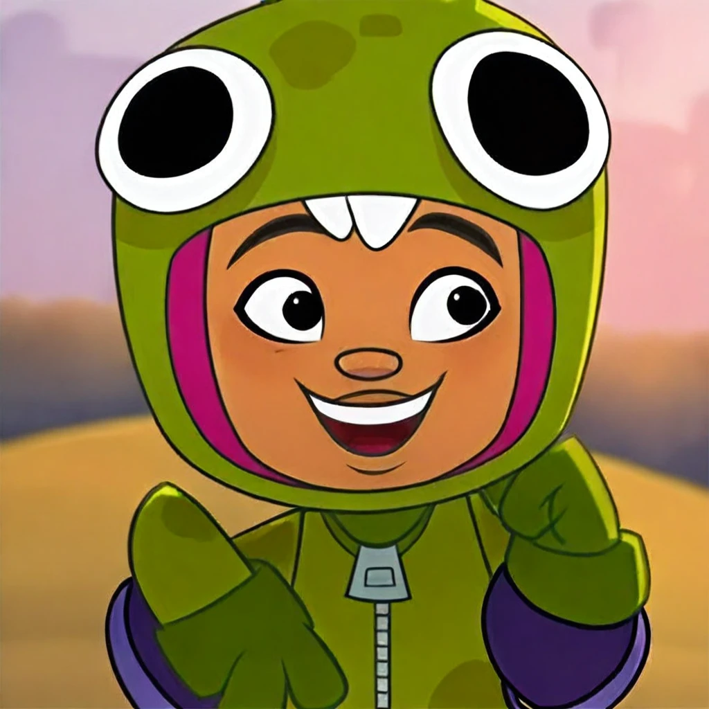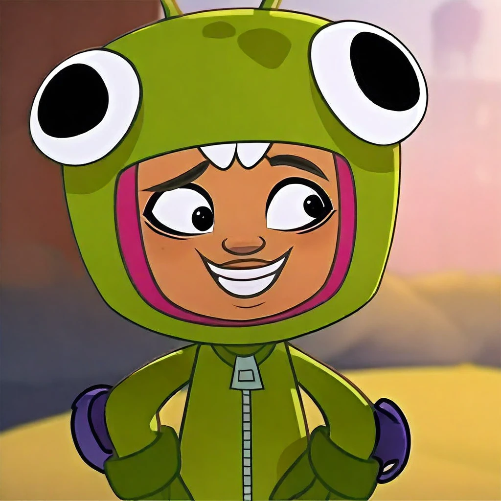 1girl, solo, yutani, subwaysurfers, very upturned nose, Japanese girl, black hair, black eyes, full-body green alien costume, skateboard elbow pads, perfect teeth, eyeliner, green gloves,
