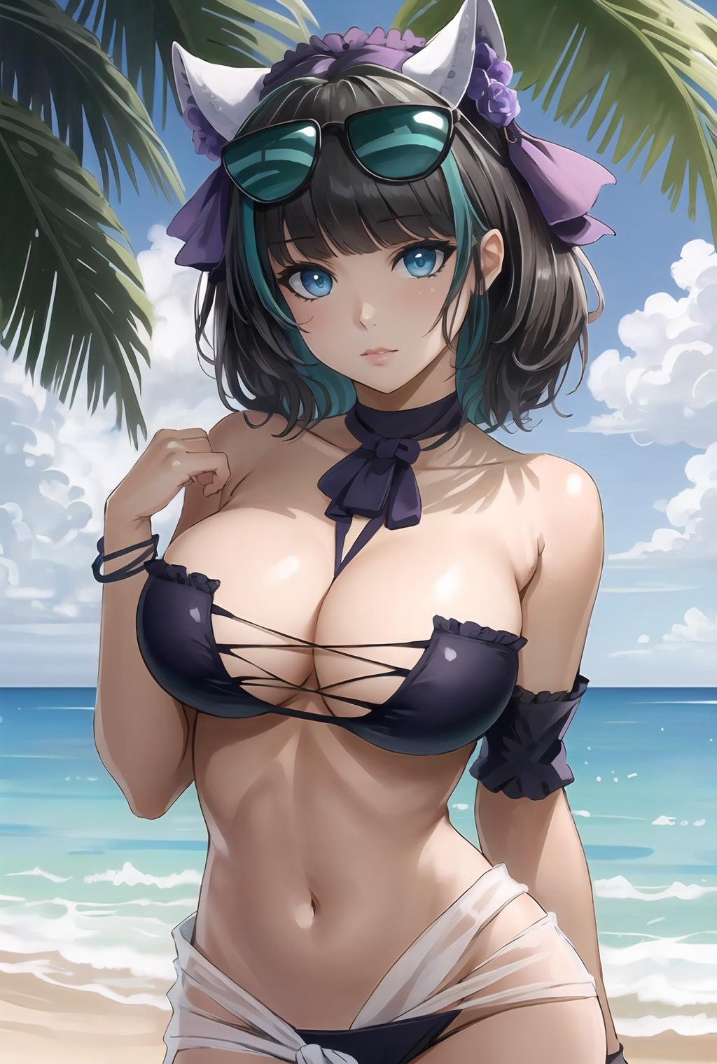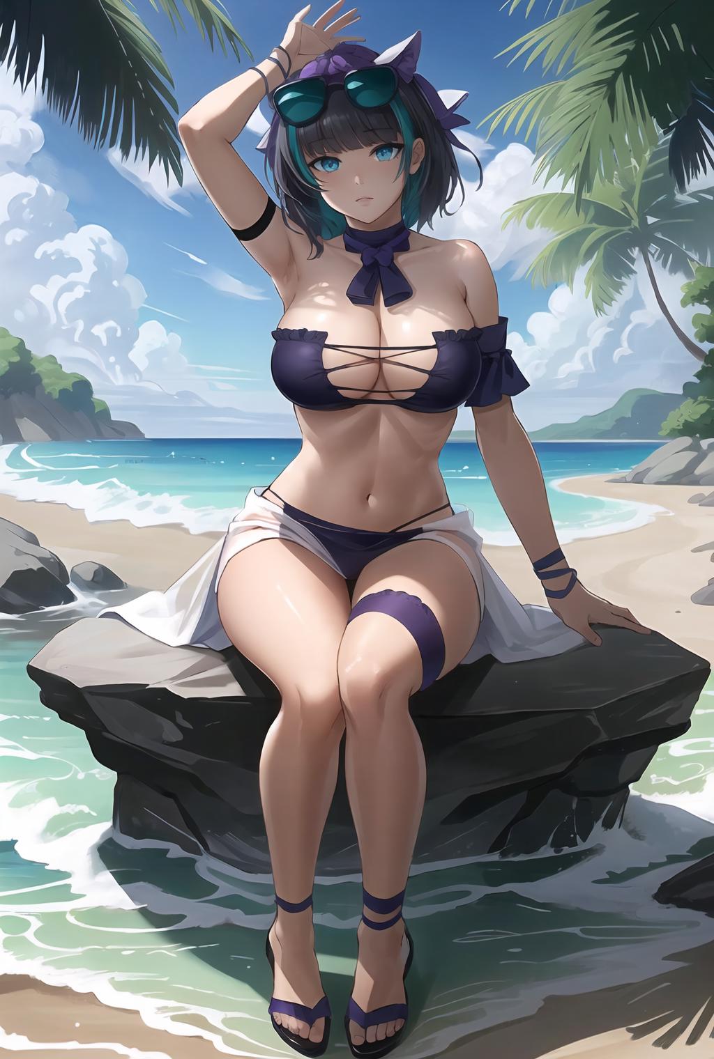 For outfit: strapless bikini, eyewear on head, frilled armband, legband, sarong