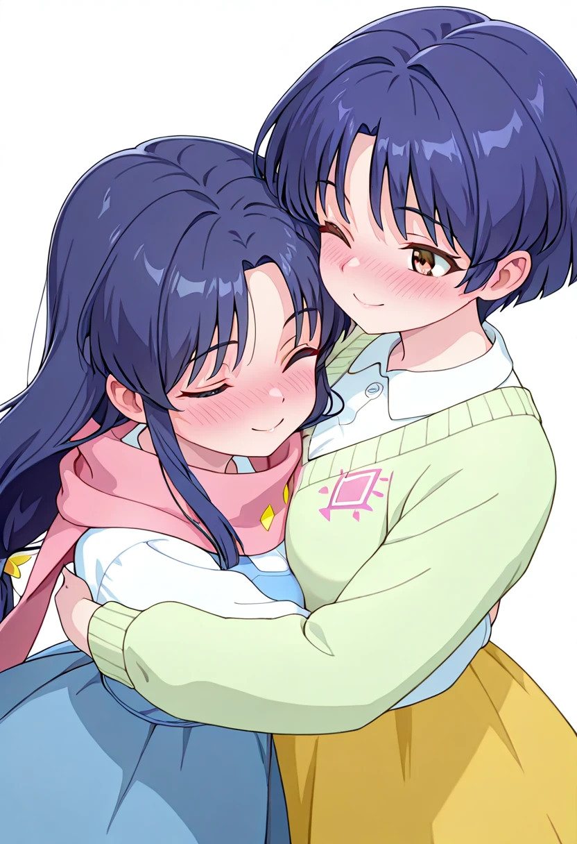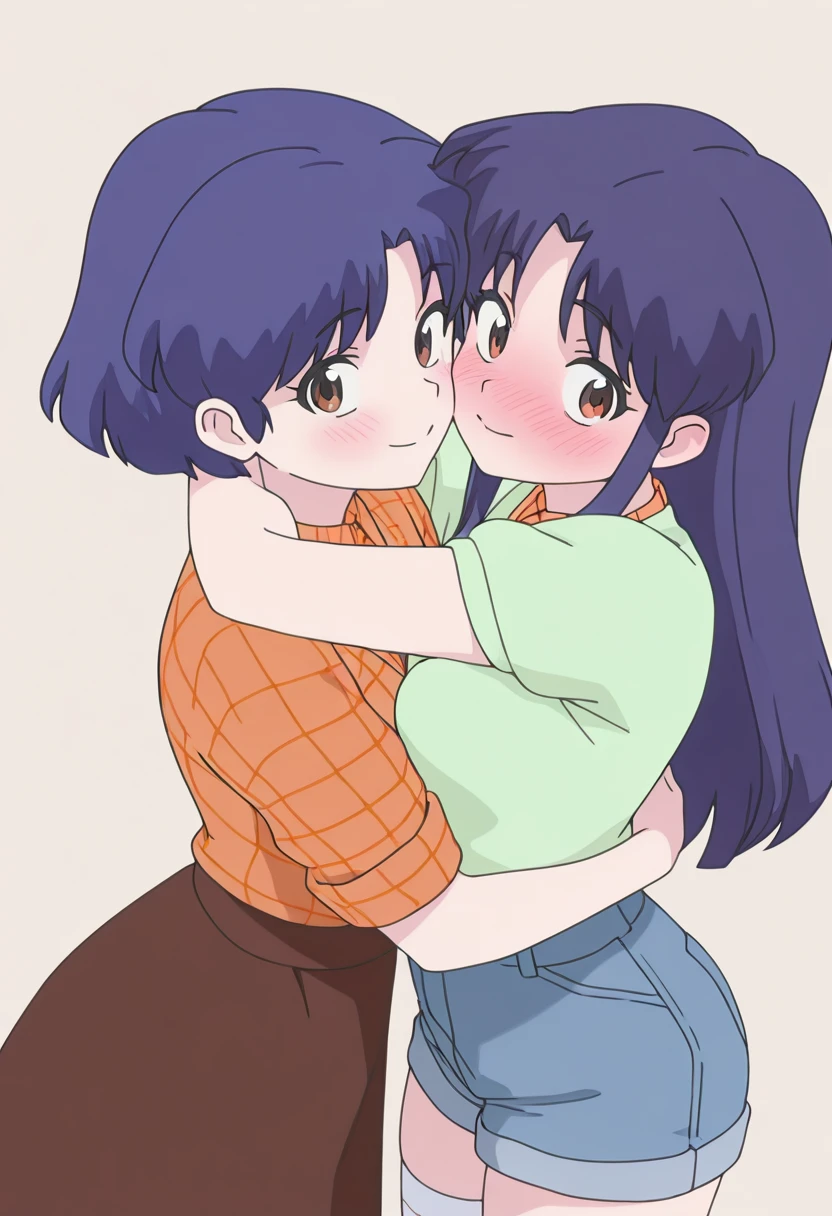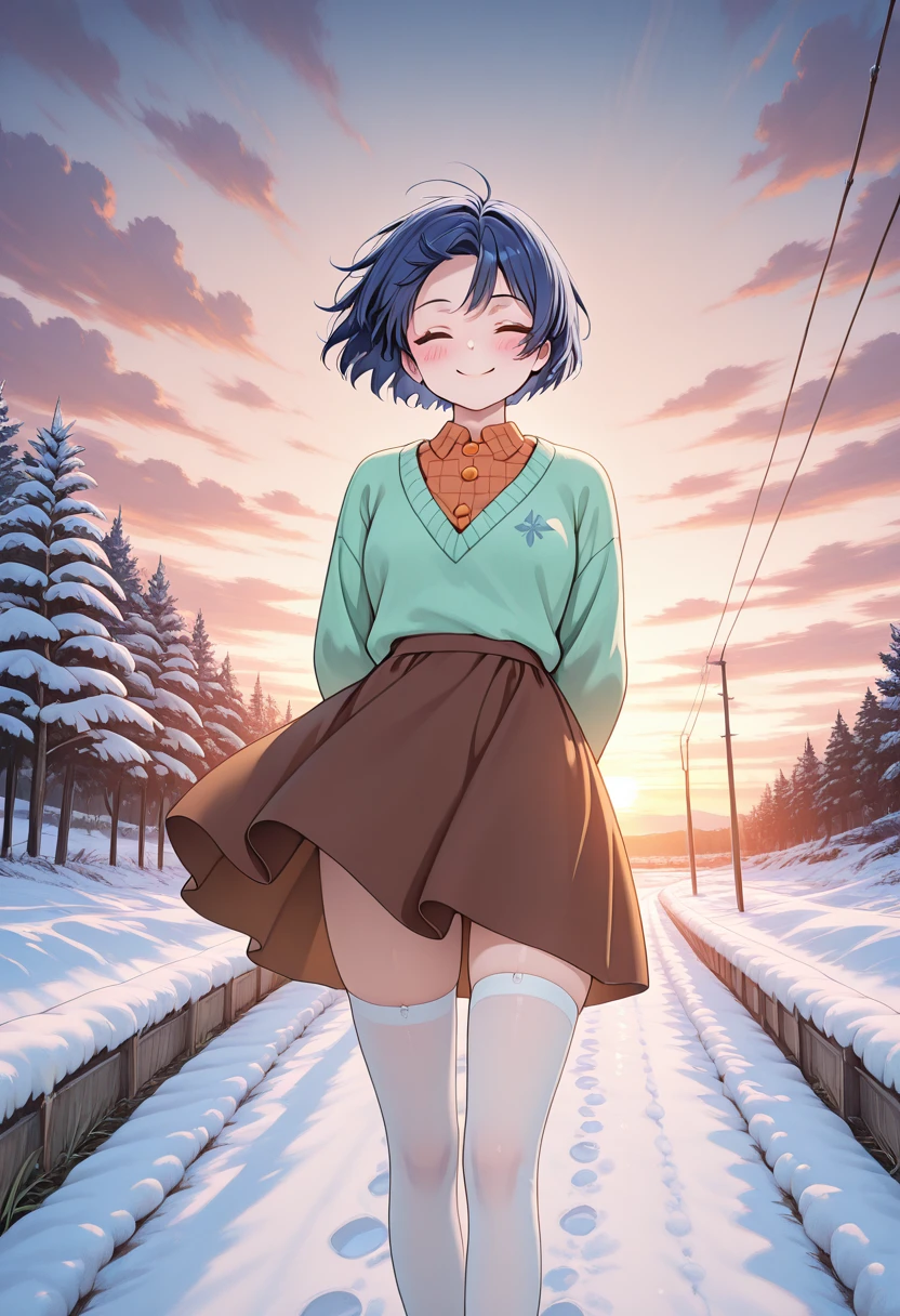 AkaneChan, wintercasual2, 1girl_a, blue hair, short hair, brown skirt, long white stockings, orange plaid shirt, V-neck sweater, green sweater