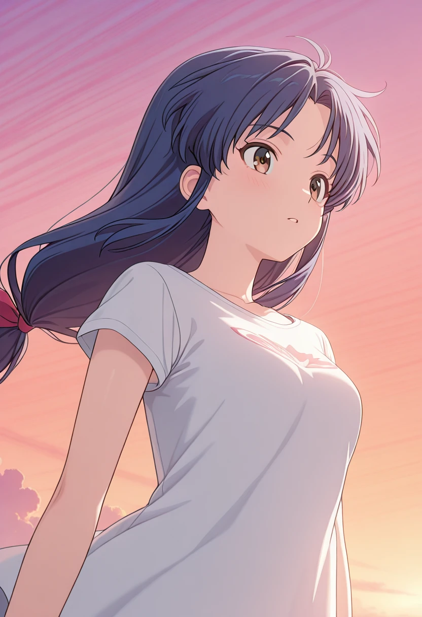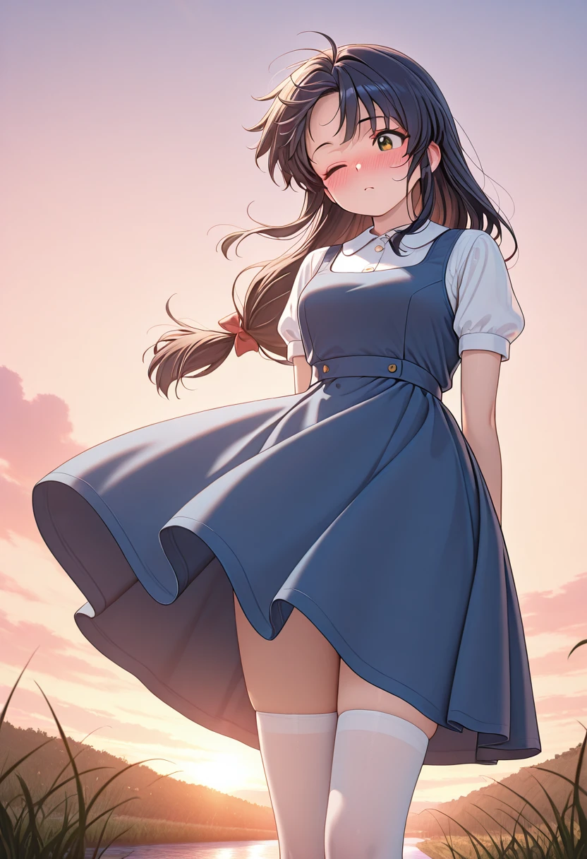 AkaneChan, Furinkanschool, 1girl, school uniform, brown eyes, white shirt, short sleeves, puffy sleeves, collared shirt, blue dress, pinafore dress