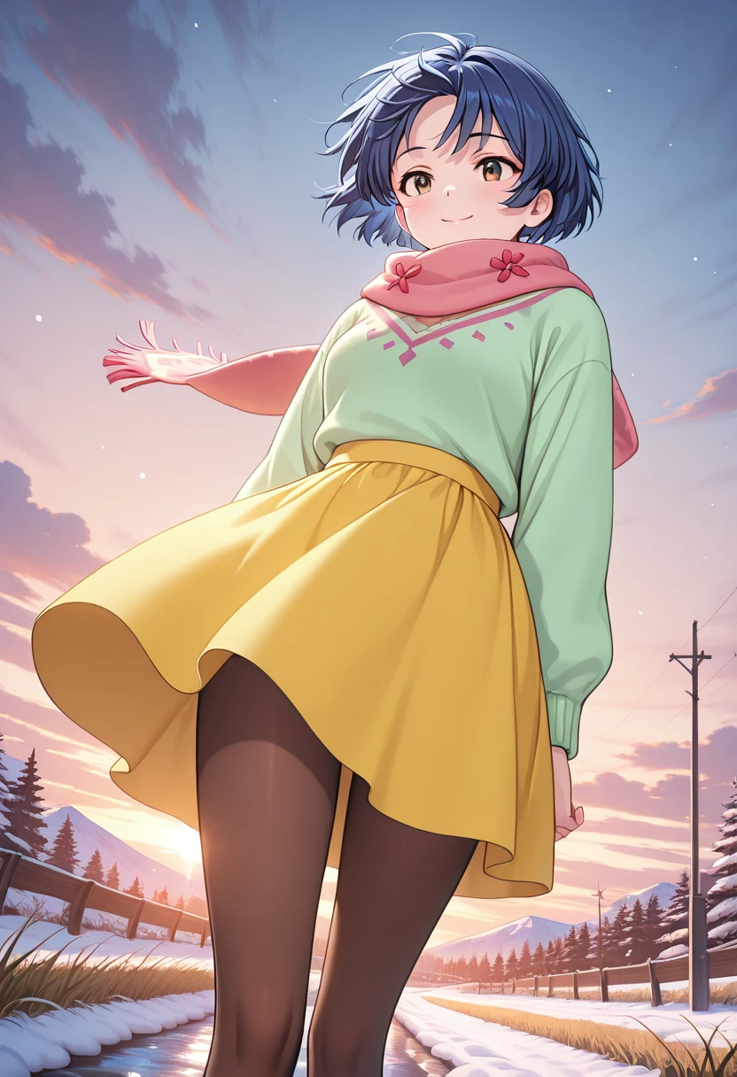 AkaneChan, wintercasual, 1girl, blue hair, short hair, brown eyes, sweater, long sleeves, green sweater, yellow skirt, pink scarf, brown legwear