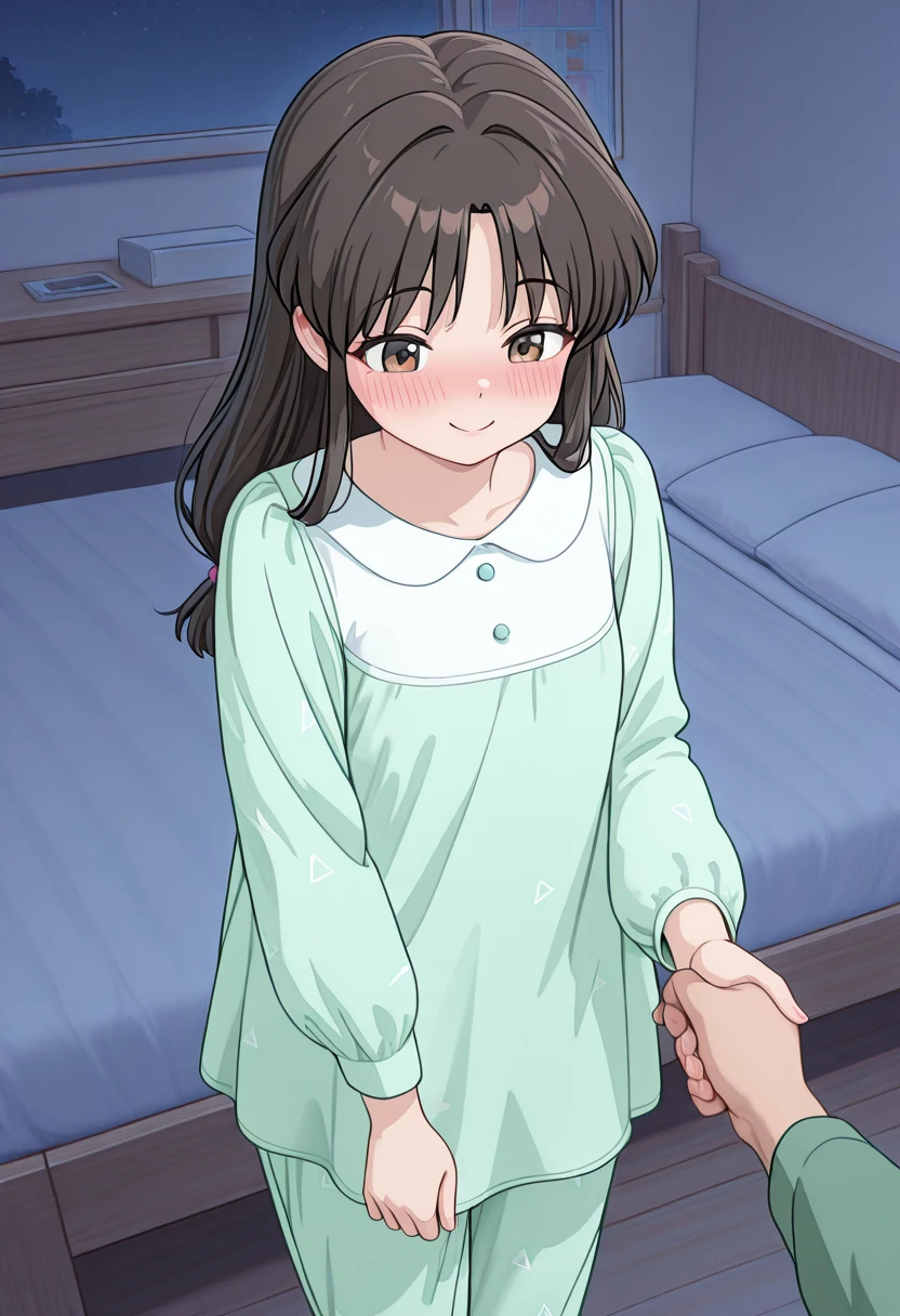 AkaneChan, greenPijama, 1girl, pajamas, green shirt, long sleeves, green pants, shirt