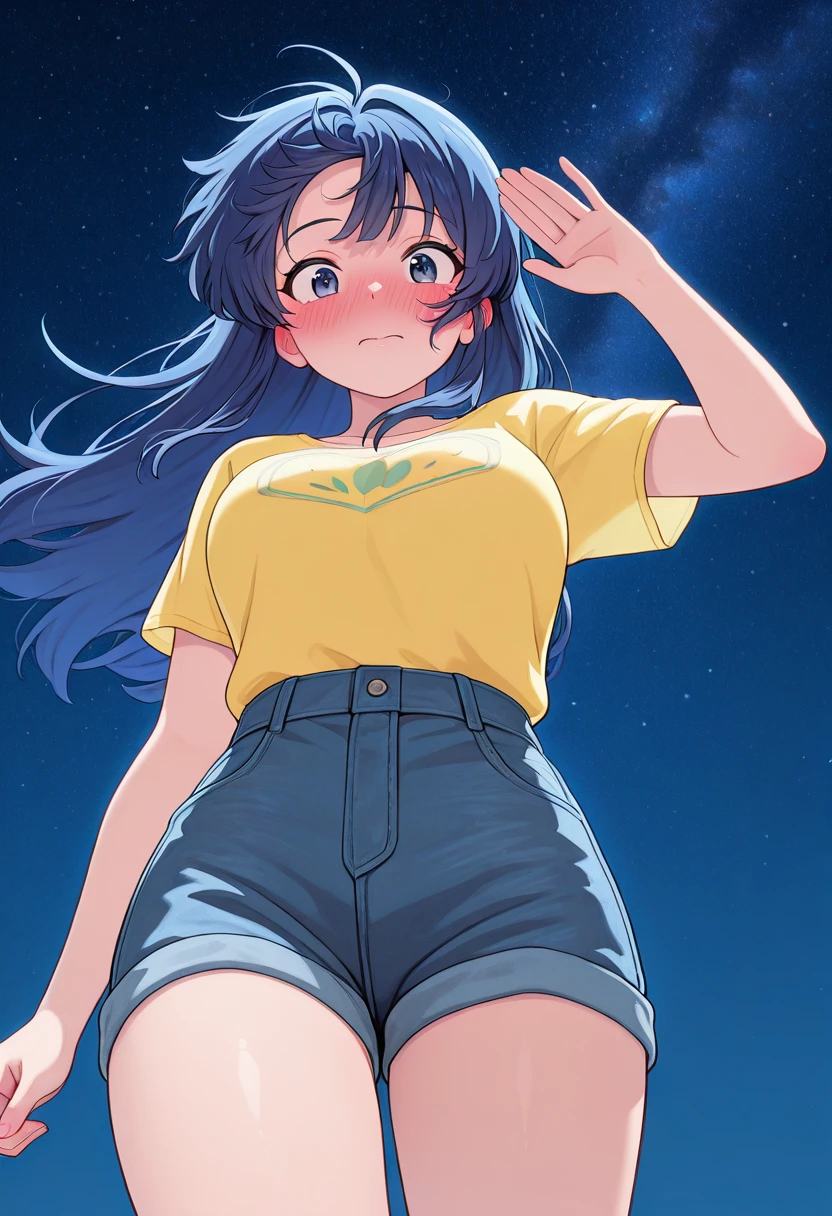 AkaneChan, casualAka1, long hair,blue hair, yellow shirt, denim shorts