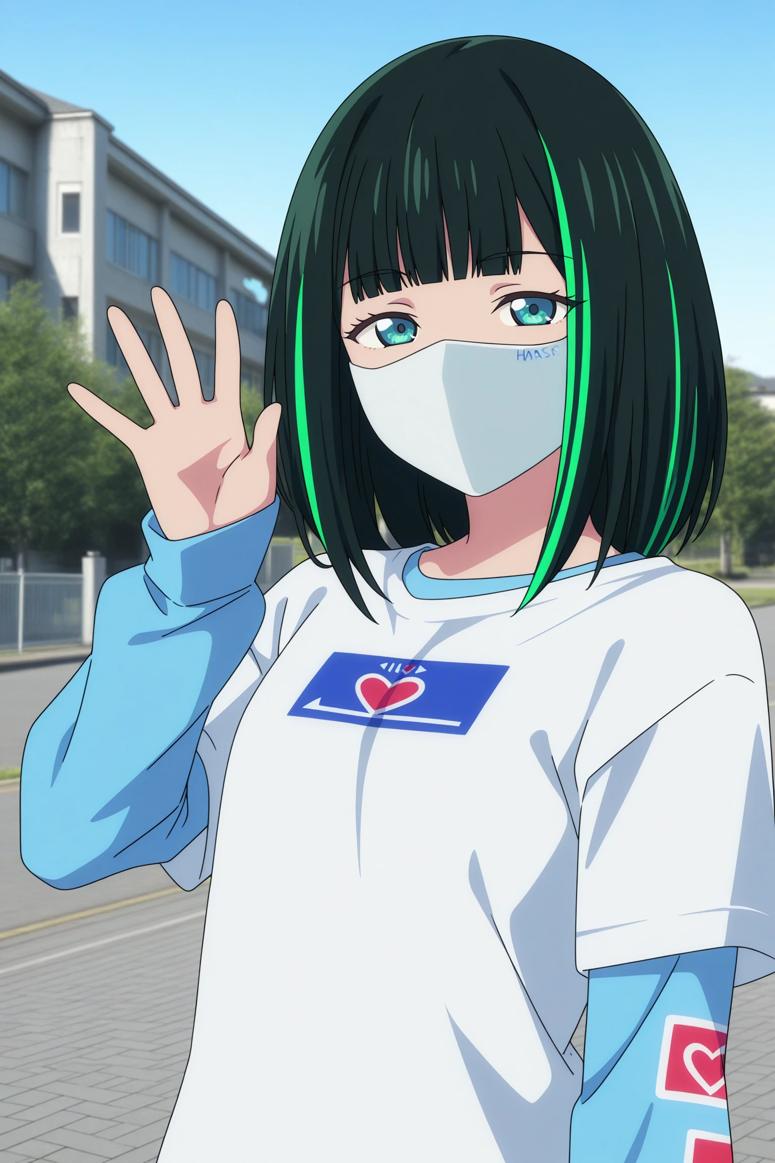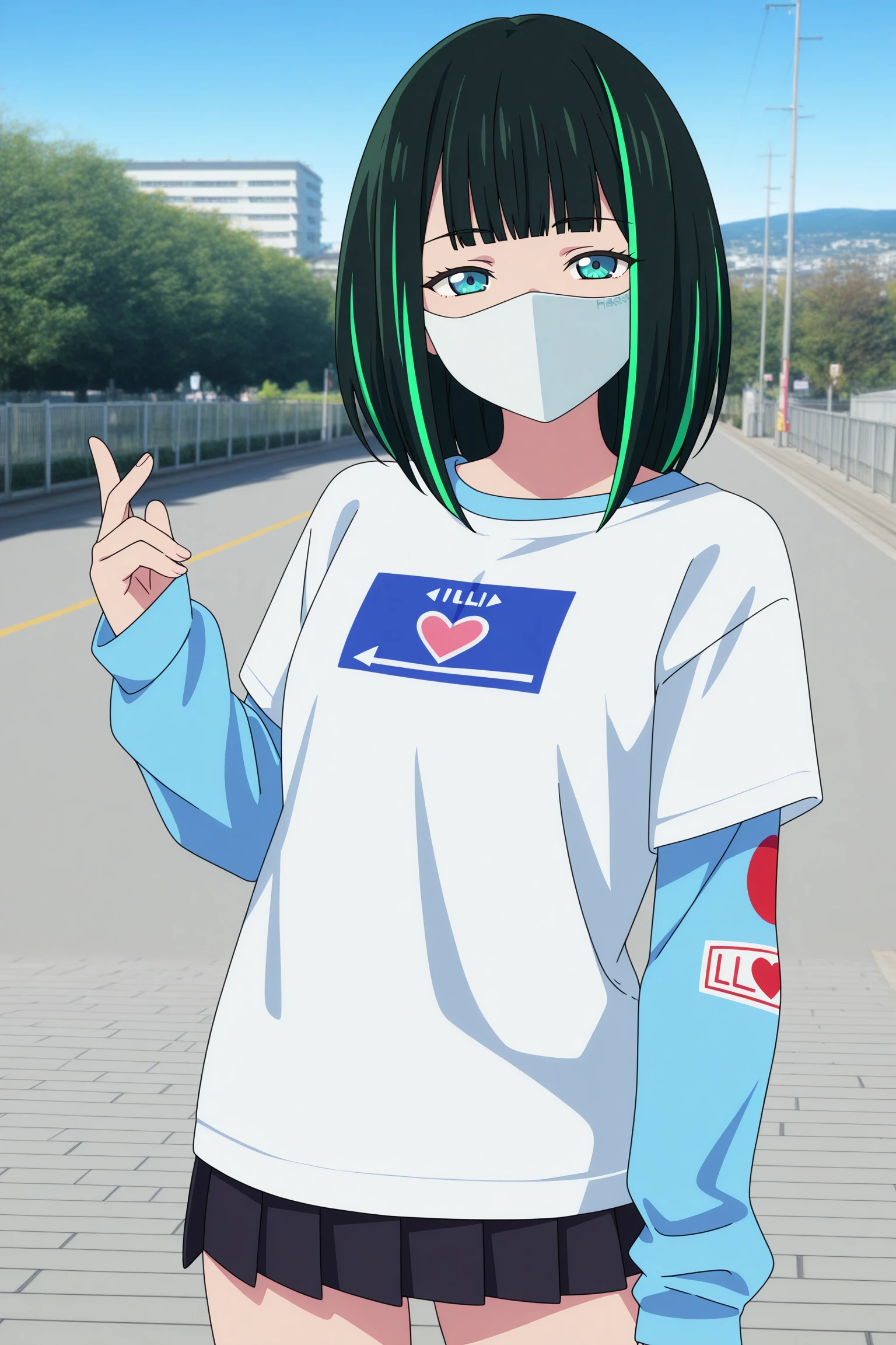 hass, medium hair, green hair, multicolored hair, streaked hair, blunt bangs, aqua eyes, white mask, mouth mask, short over long sleeves, blue shirt, white shirt, print shirt, untucked shirt, black skirt, pleated skirt, green socks, loose socks, blue footwear, sneakers