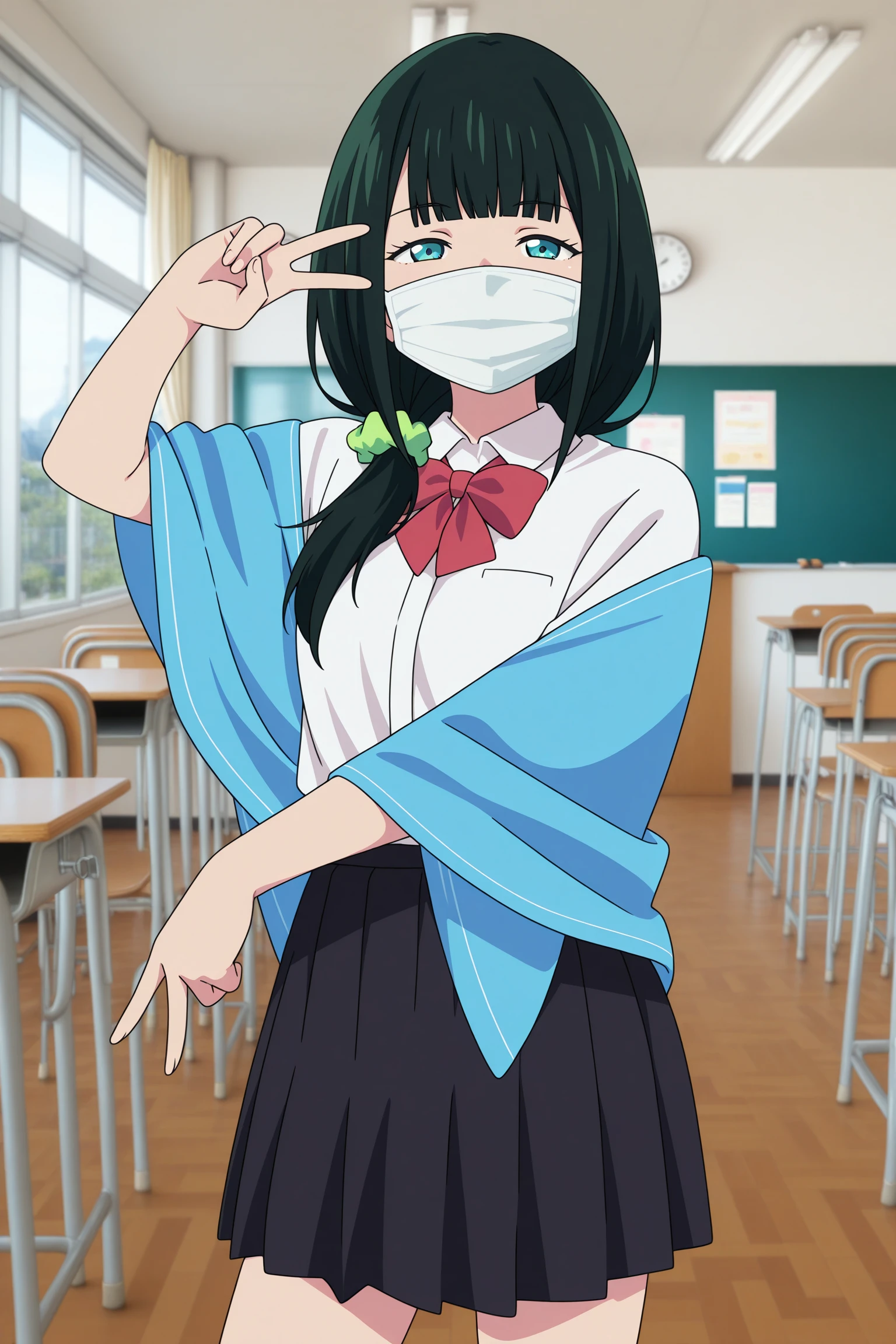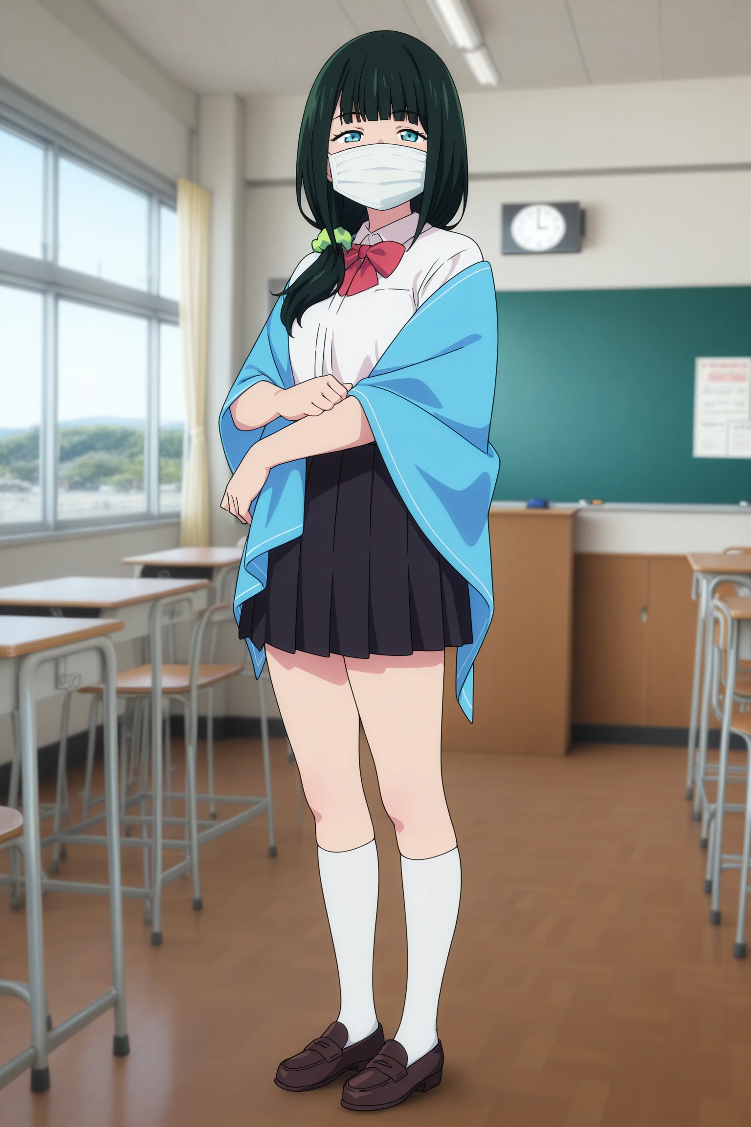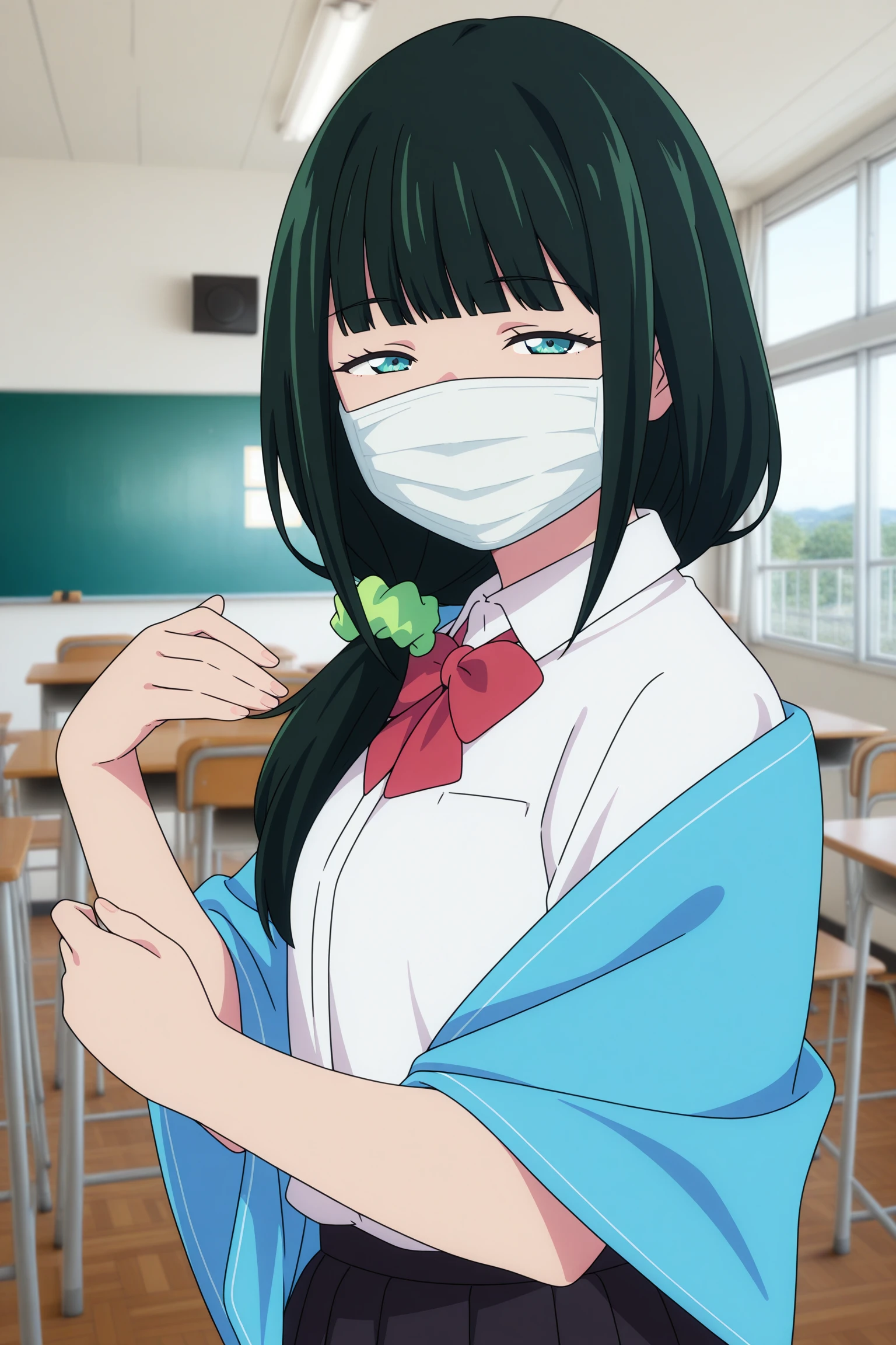 hass, long hair, green hair, low ponytail, hair scrunchie, blunt bangs, aqua eyes, white mask, surgical mask, short sleeves, white shirt, collared shirt, red bowtie, blue shawl, black skirt, pleated skirt, white socks, kneehighs, brown footwear, loafers