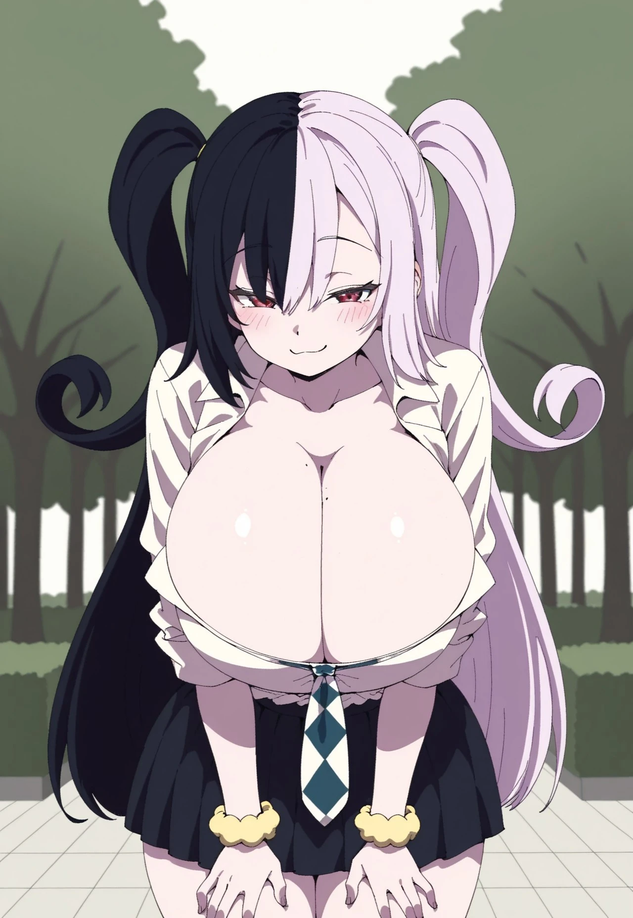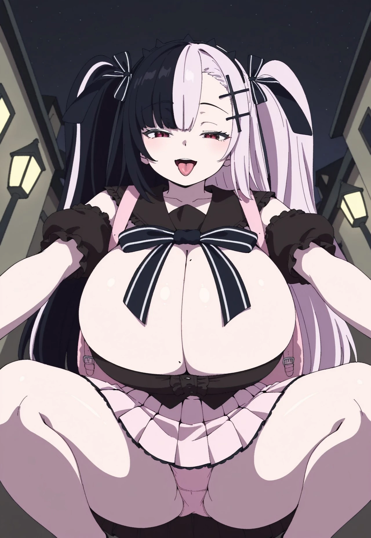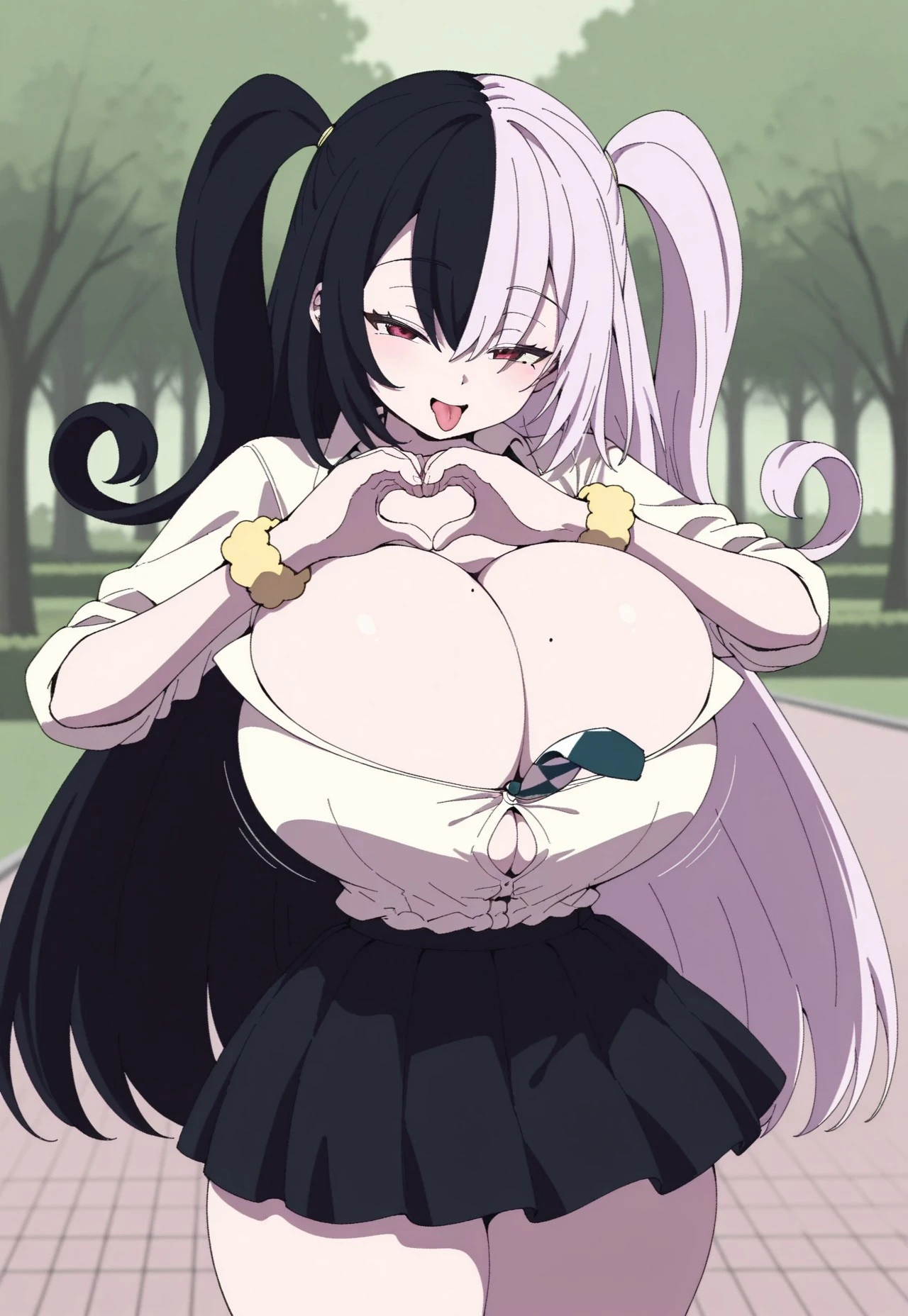 Towa(kaisouafuro-il), black and white hair, split hair, split-color hair, two twirl side ups, red eyes, long hair, mole on breast, mole, huge breasts