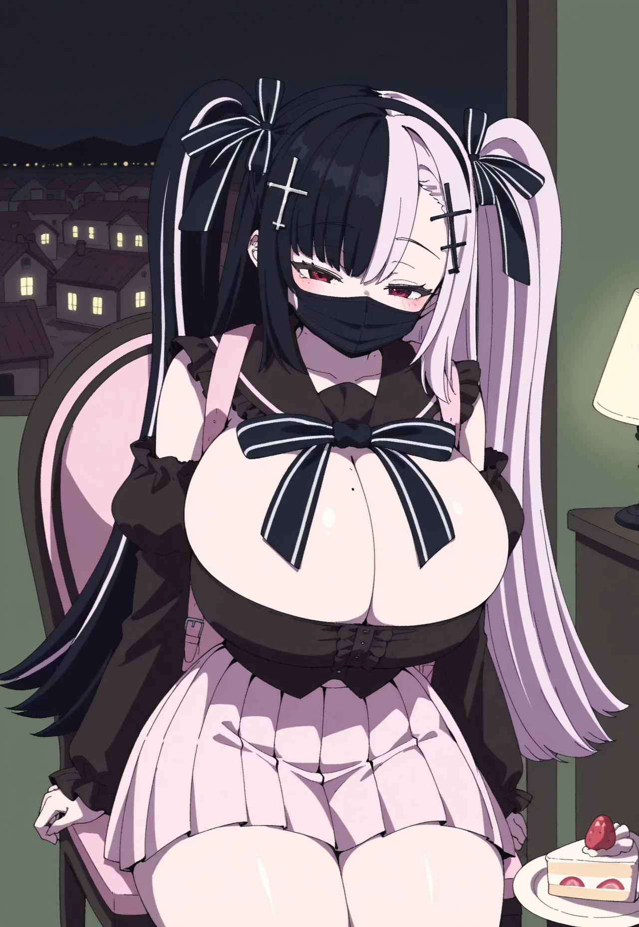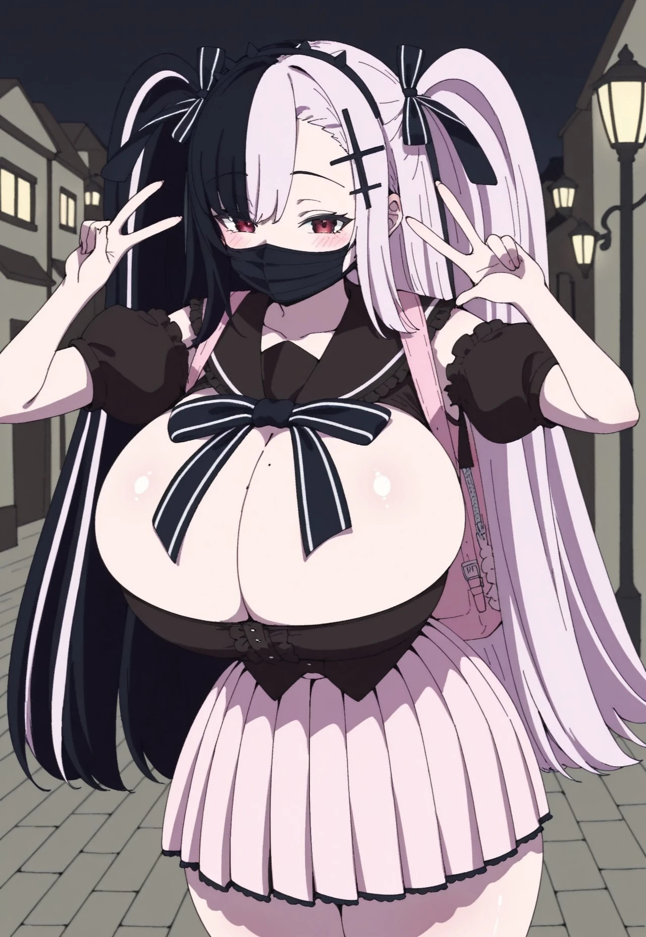 towa's jirai kei outfit, mouth mask, cleavage, pink backpack, pink skirt, pleated skirt, black frilled sleeves, detached sleeves, black frilled shirt, black sailor collar, black and white outlined neck ribbon, right asymmetrical bangs, black bows in side ups, black cross hair ornaments, black spikey headband,