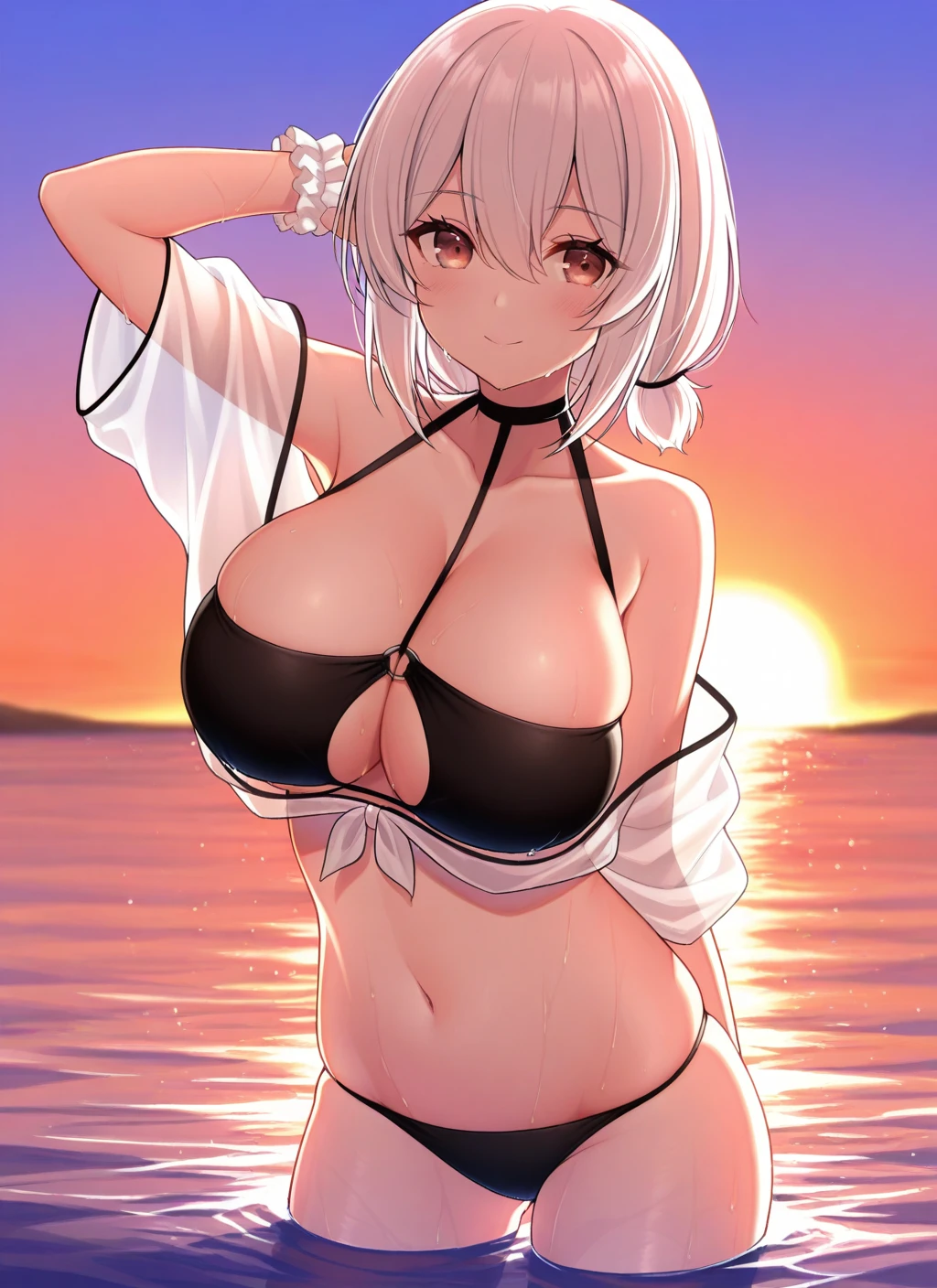 盛夏的Seirios(scorching-hot_seirios):sirius \(azur lane\), short hair,low short twintails,red eyes, swimsuit,black bikini, heart-shaped eyewear, wrist scrunchie, scrunchie, o-ring top, thigh strap, see-through,