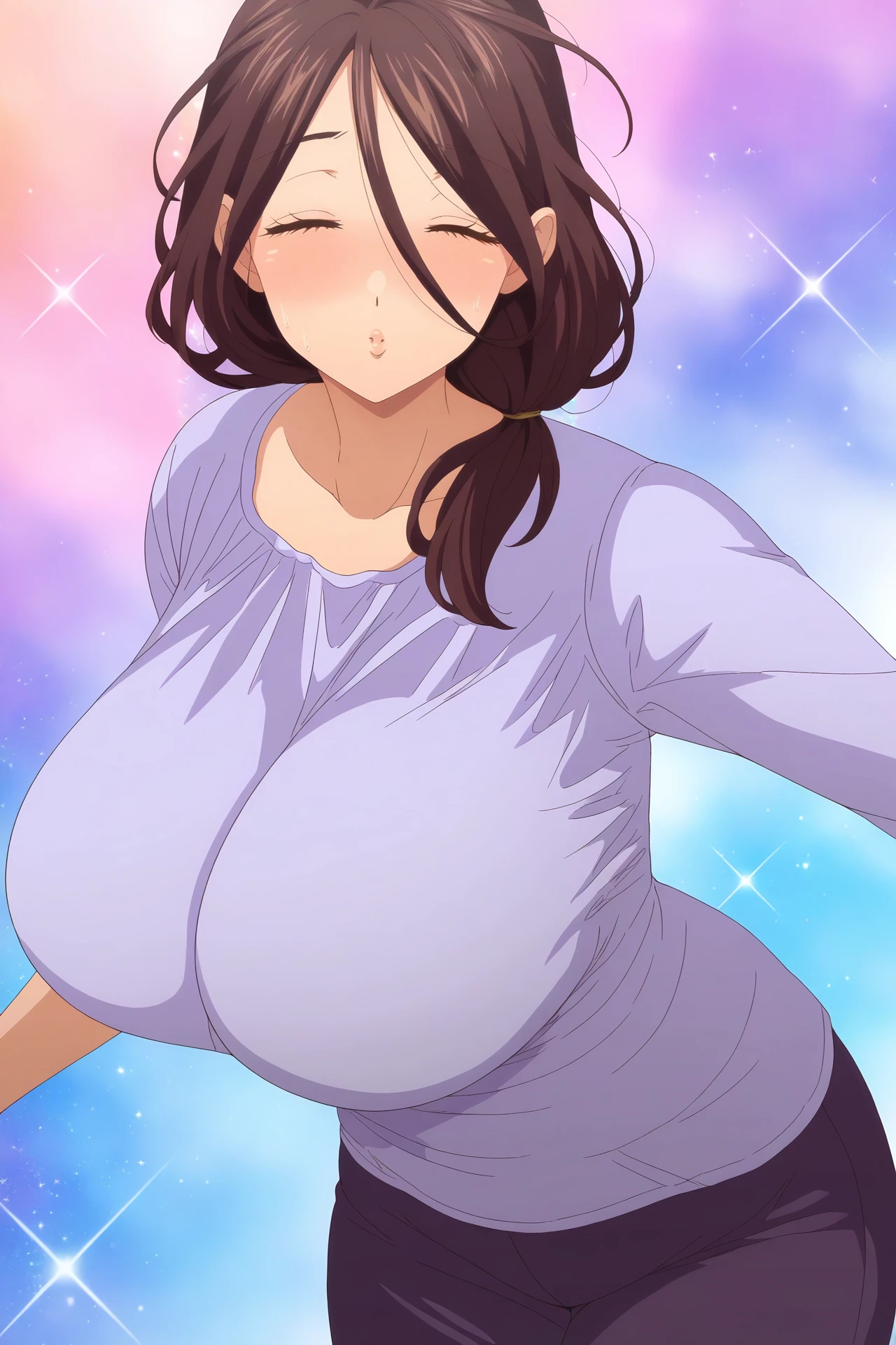 Yuko Mibu,1girl,solo,mature female,brown hair,long hair,hair between eyes,closed eyes,huge breasts,