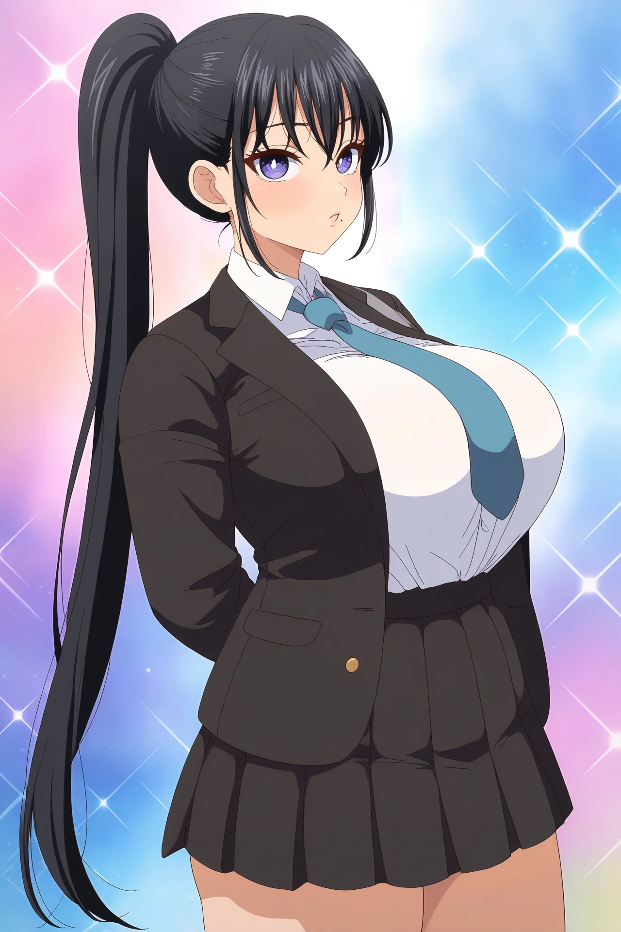 Aoi Mibu,1girl,solo,black hair,long hair,ponytail,purple eyes,huge breasts,mole under mouth