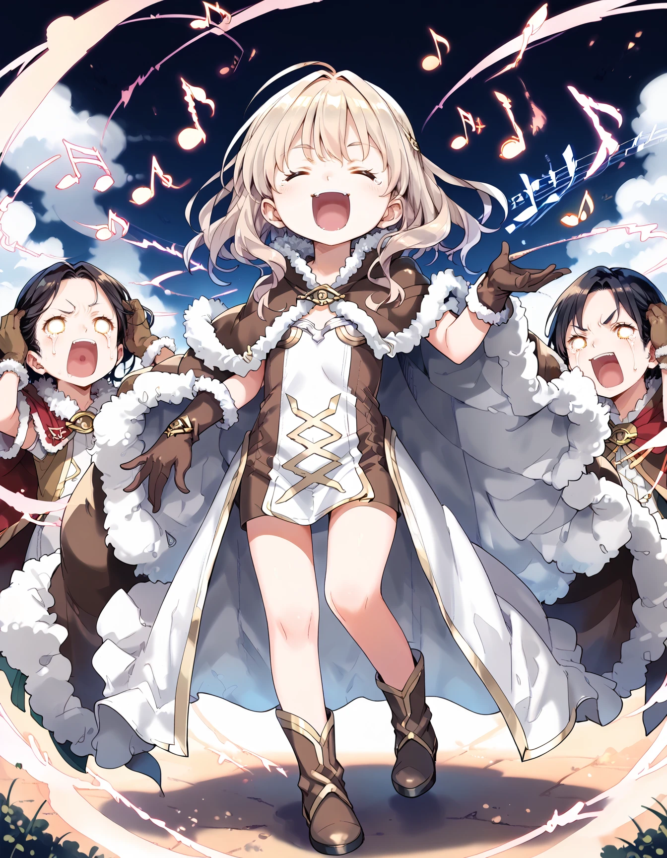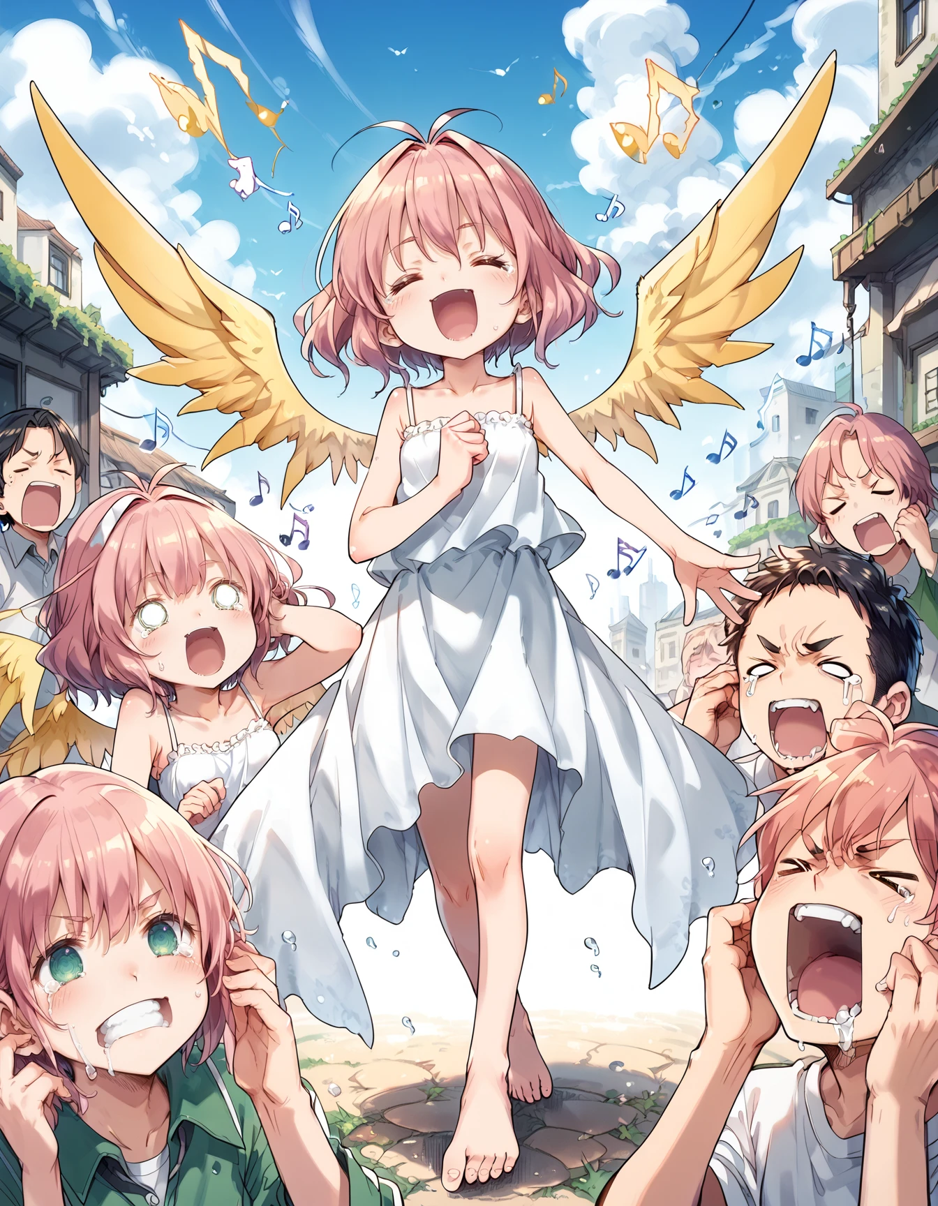 bad singing,crowd,happy,grimace,(hands on own ears:1.2),music,noisy musical note,