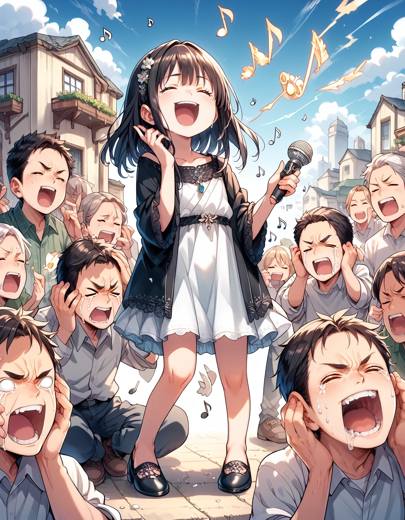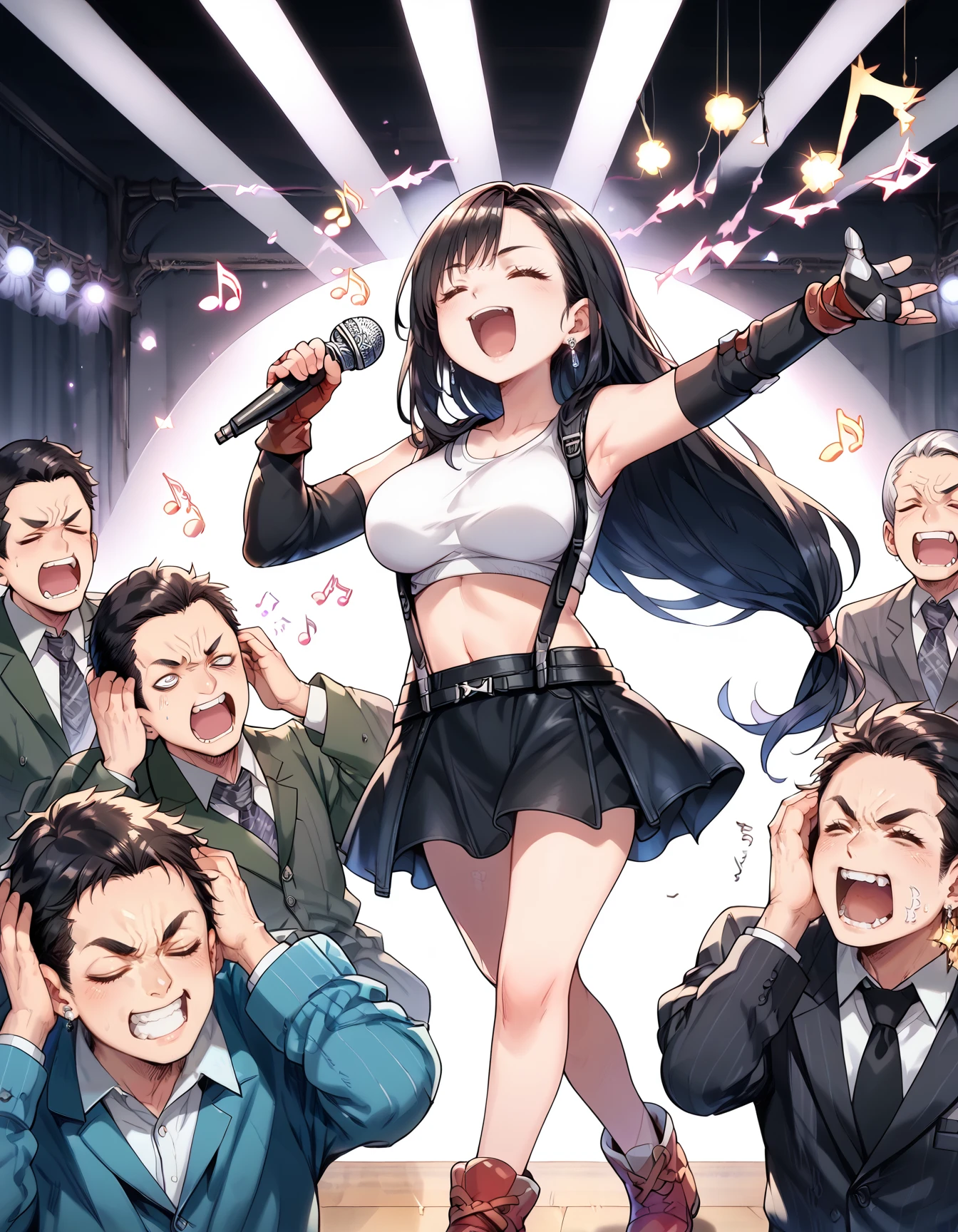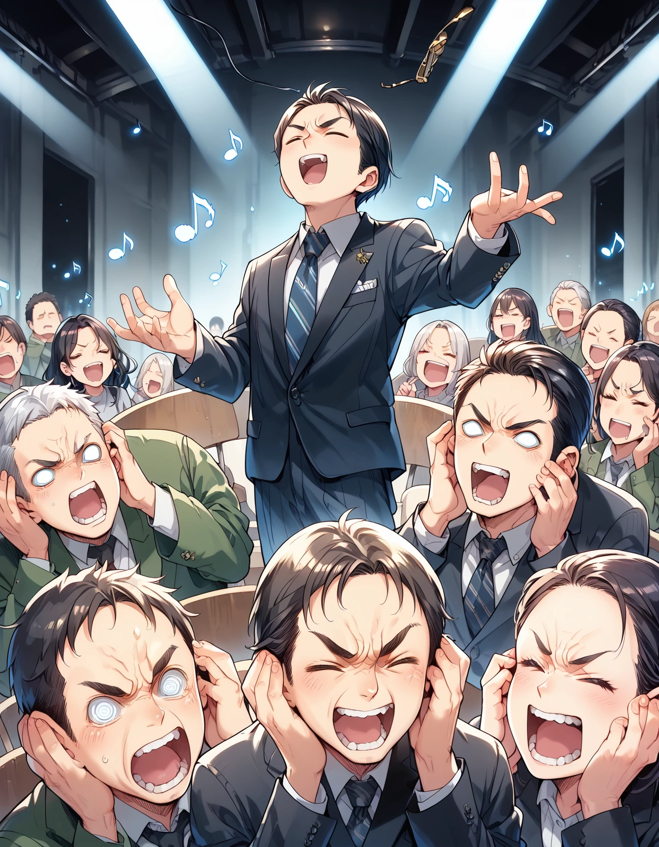 bad singing,crowd,happy,grimace,(hands on own ears:1.2),music,noisy musical note, multiple boys,screaming,closed eyes,blank eyes,holding microphone,