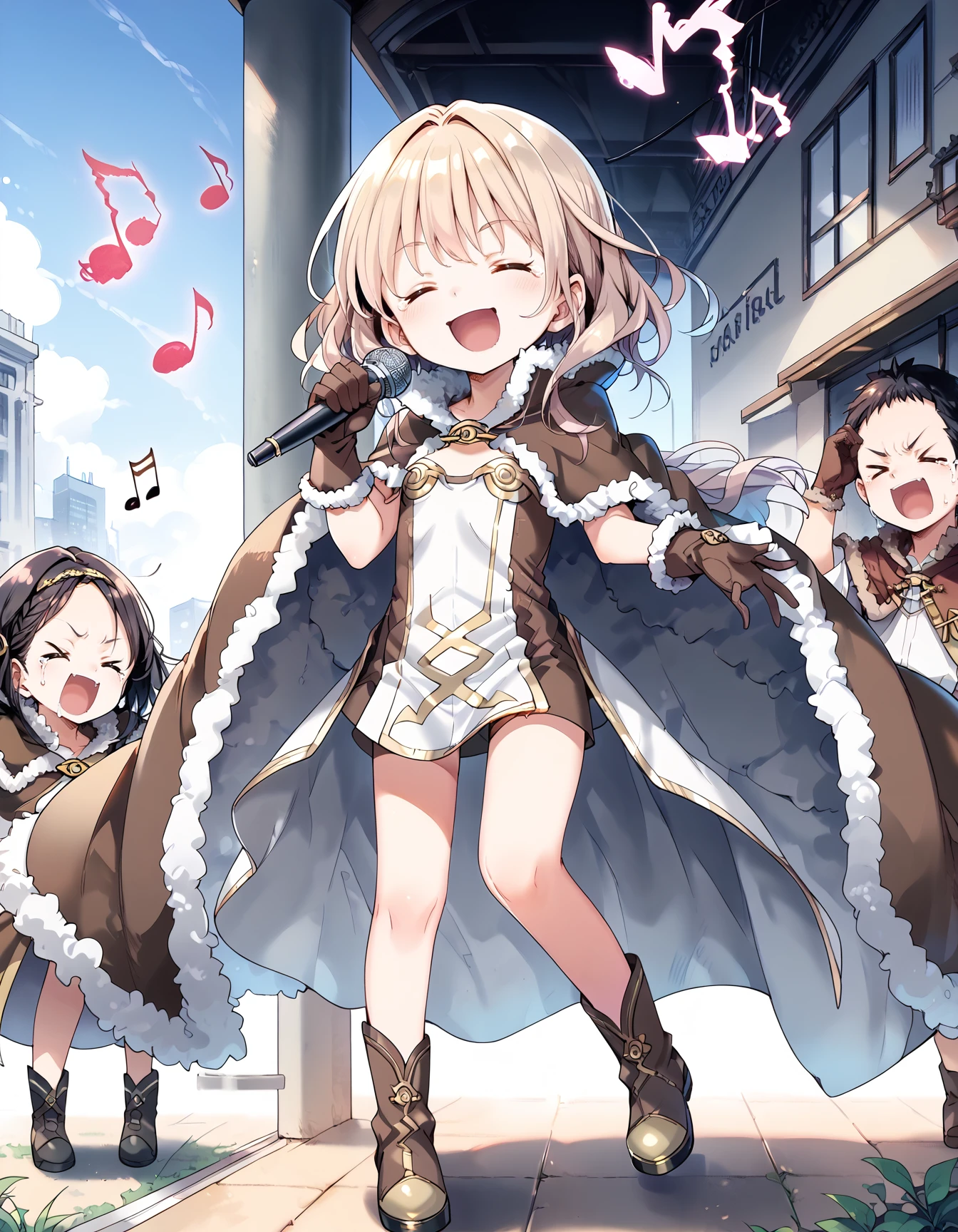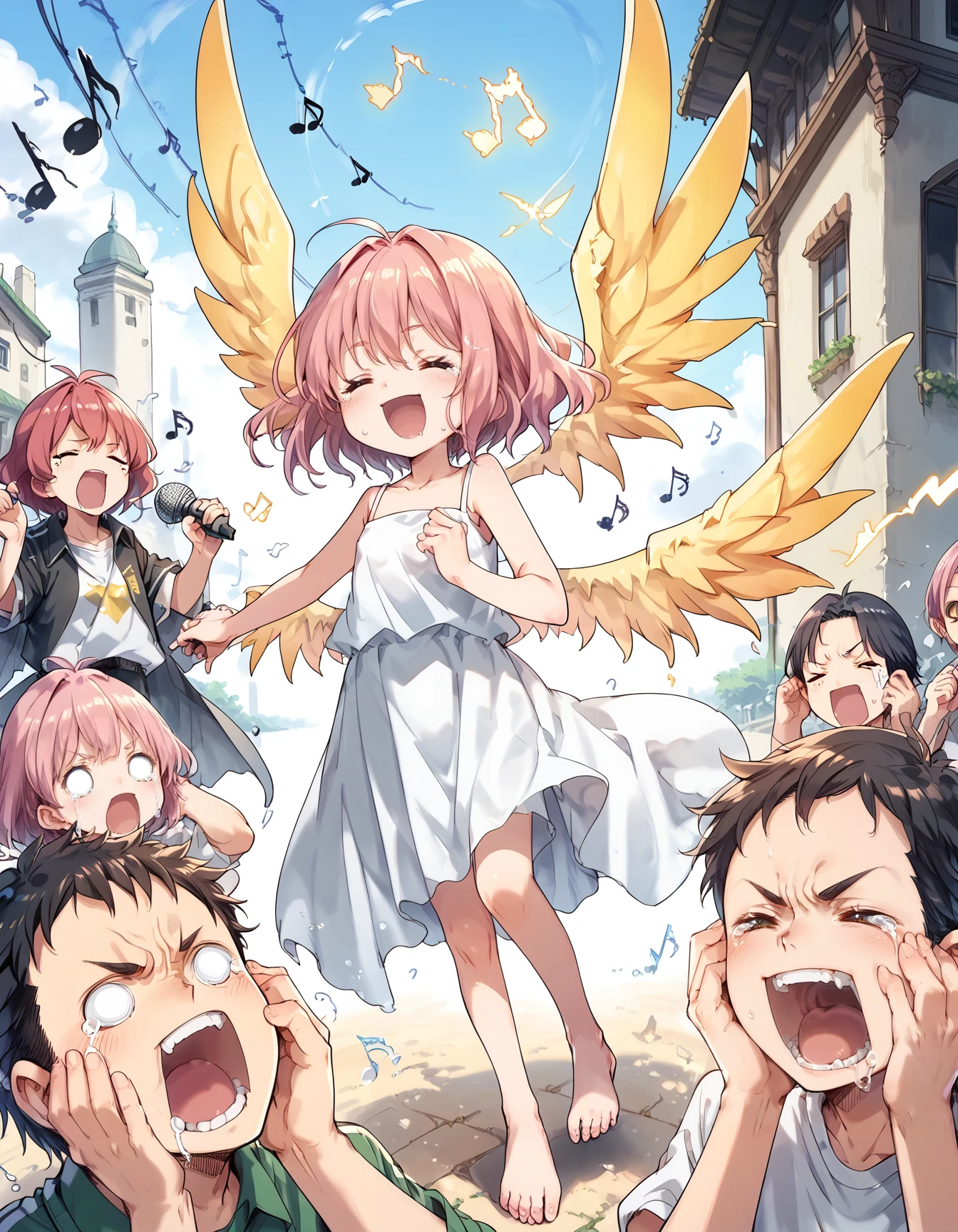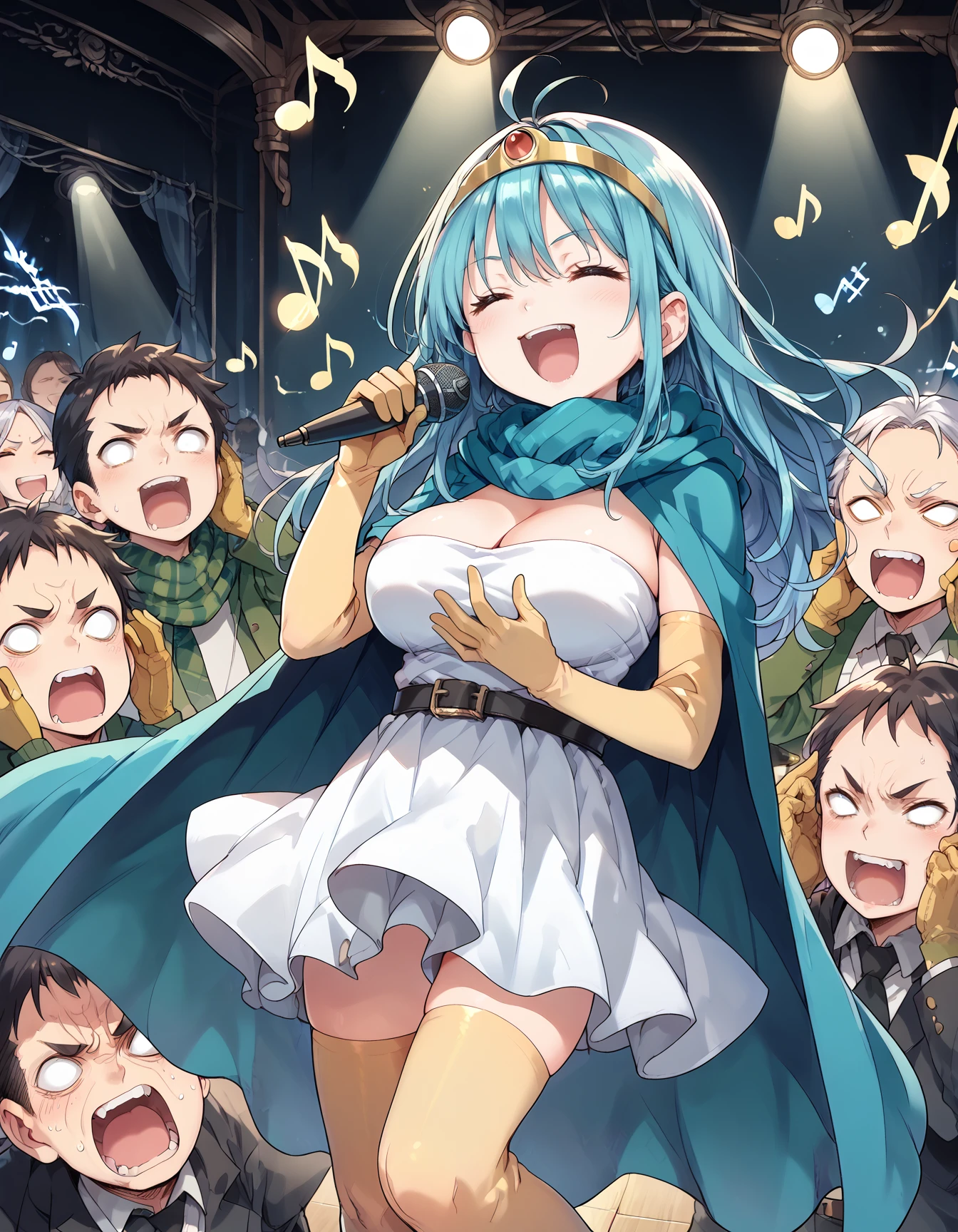bad singing,crowd,happy,grimace,(hands on own ears:1.2),music,noisy musical note, multiple boys,screaming,closed eyes,blank eyes,holding microphone,
