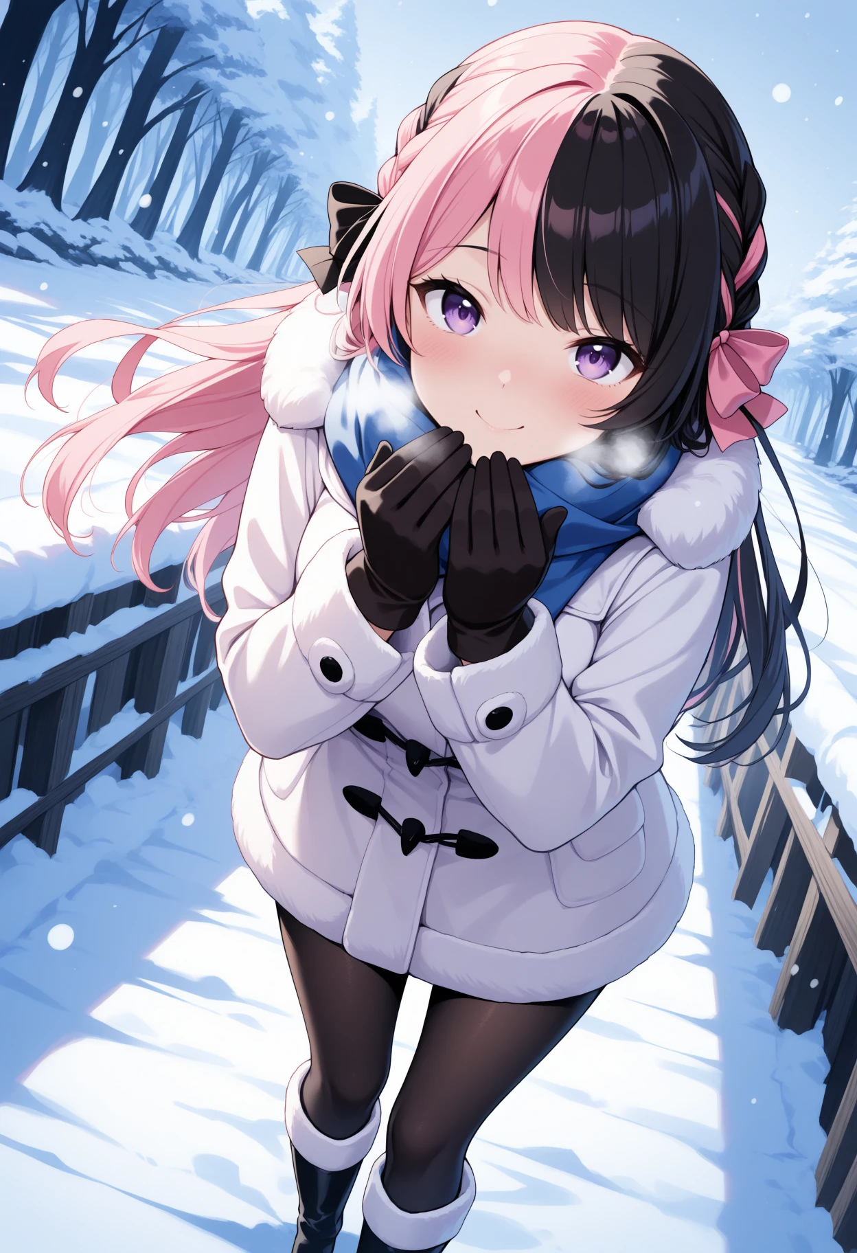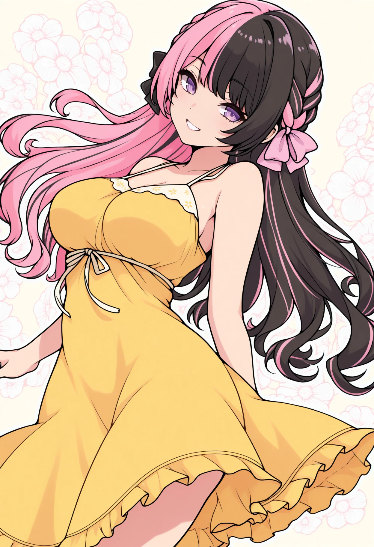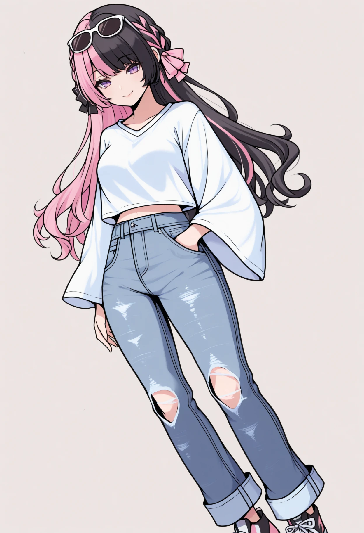 Hinan0, purple eyes, multicolored hair, pink hair, black hair, long hair, french braid, hair bowDefault outfit: