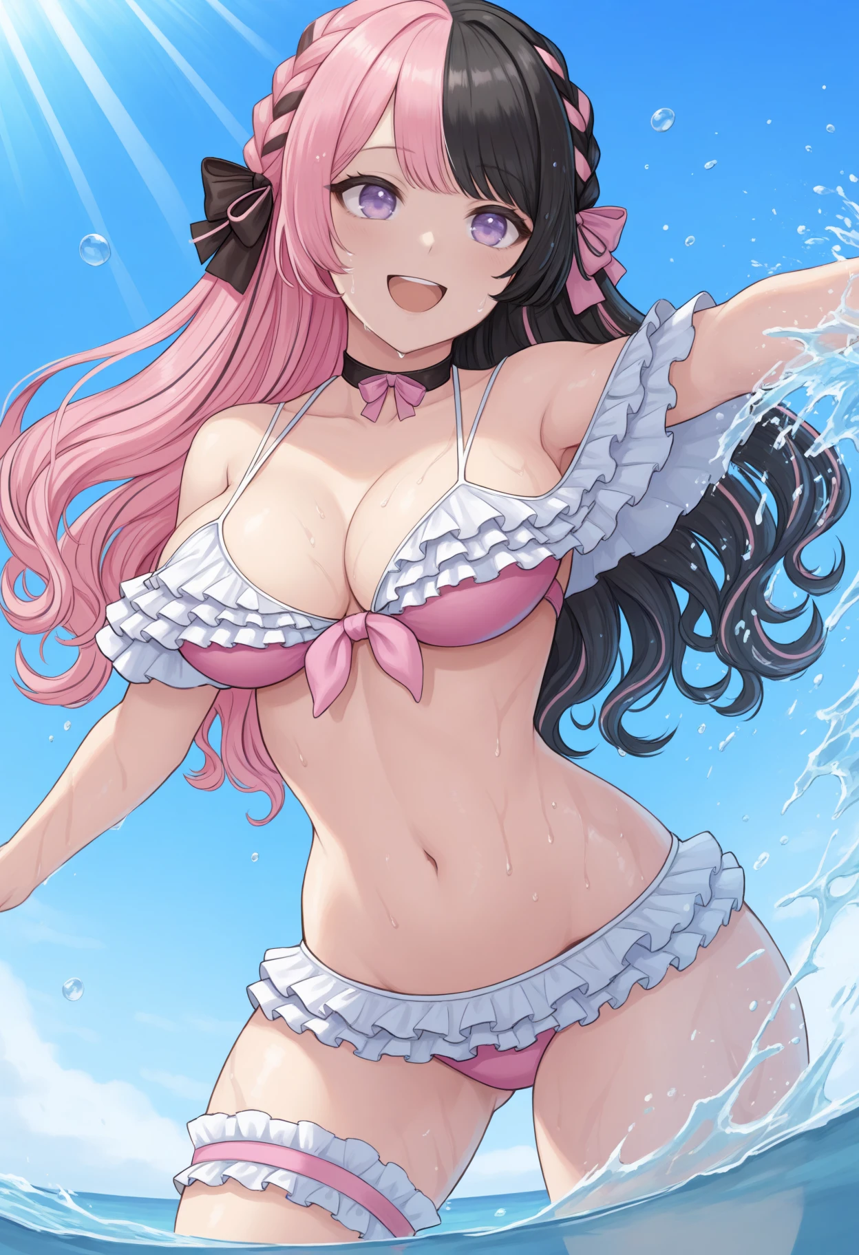 Hinan0Sum, purple eyes, multicolored hair, pink hair, black hair, long hair, french braid, hair bow, bow choker, frilled bikini, off-shoulder bikini, pink bikini, bridal garter
