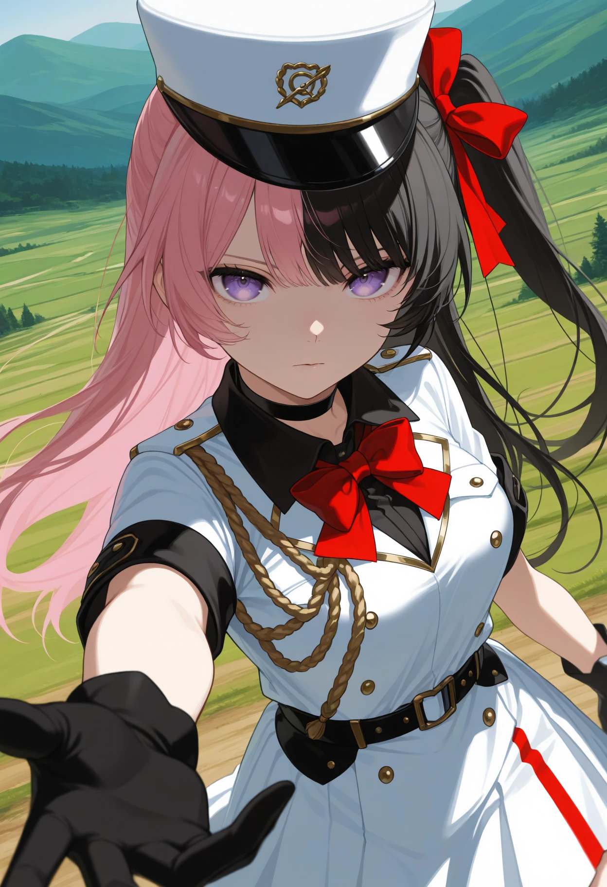 Hinan0Mltry, purple eyes, multicolored hair, pink hair, black hair, long hair, one side up, hair bow, red bow, white hat, black choker, white uniform, red bowtie, short sleeves, black belt, white skirt, black gloves