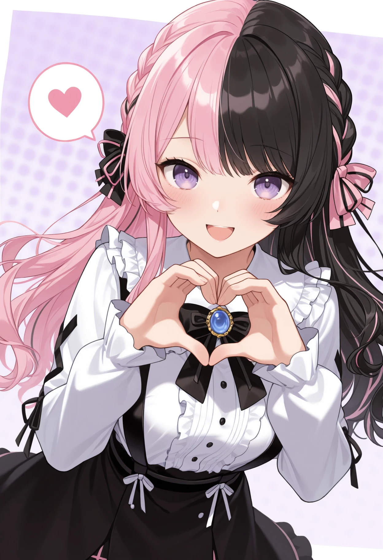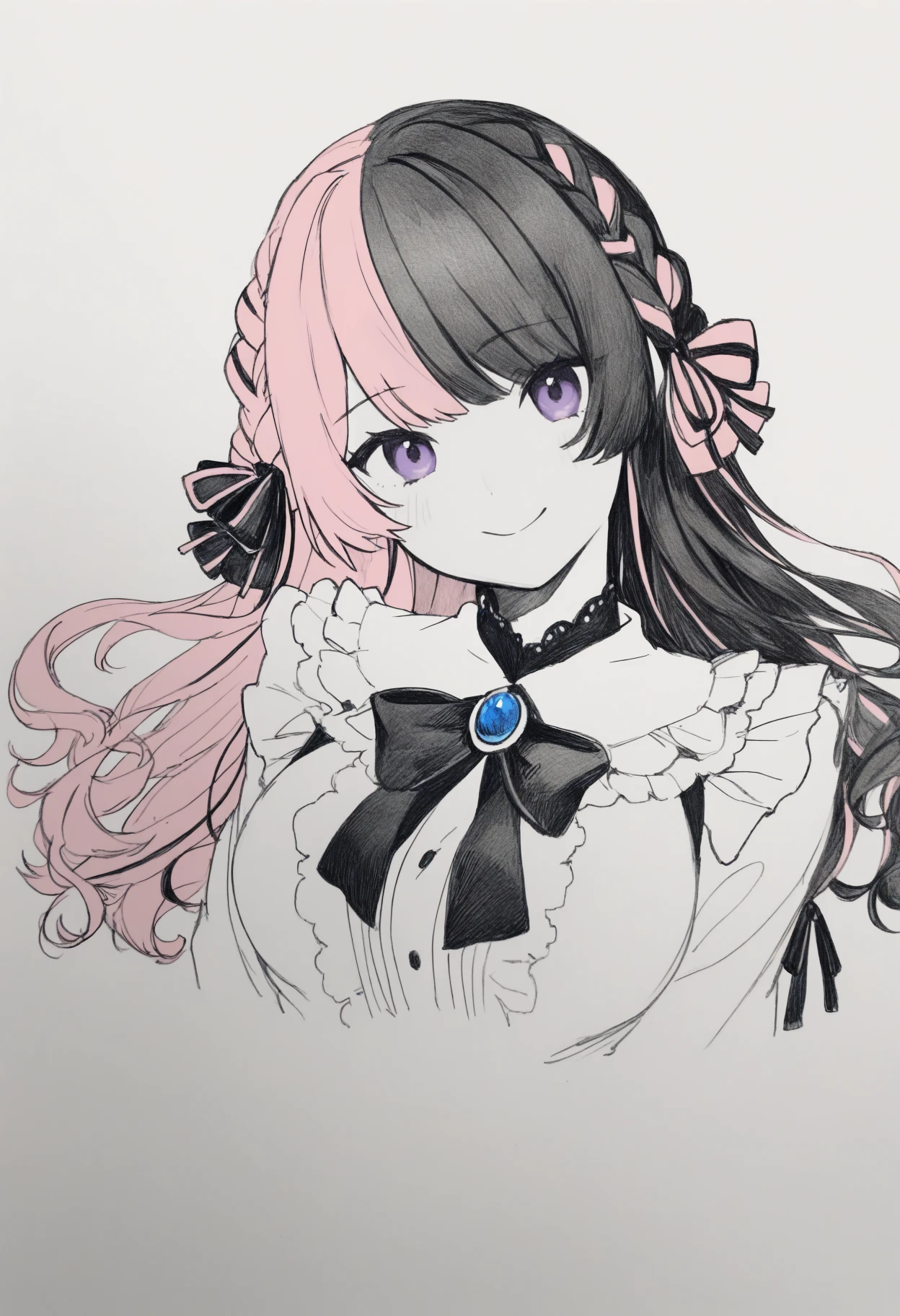 Hinan0Def, purple eyes, multicolored hair, pink hair, black hair, long hair, french braid, hair bow, black bowtie, brooch, frilled shirt, white shirt, long sleeves, black skirt, suspender skirt