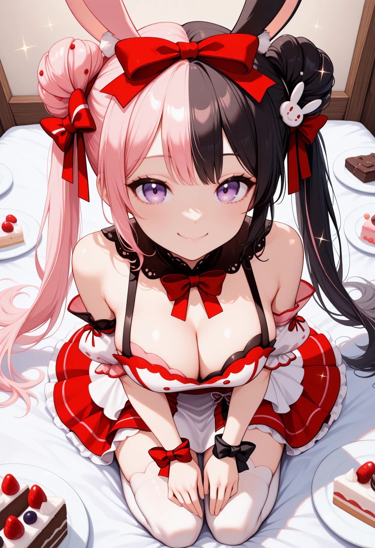 Hinan0DsrtDrss, purple eyes, multicolored hair, pink hair, black hair, long hair, double bun, twintails, rabbit ears, hair ornament, hair bow, red bow, detached collar, red bowtie, detached sleeves, multicolored dress, white dress, red dress, cleavage, wrist bow, white thighhighsSleepwear: