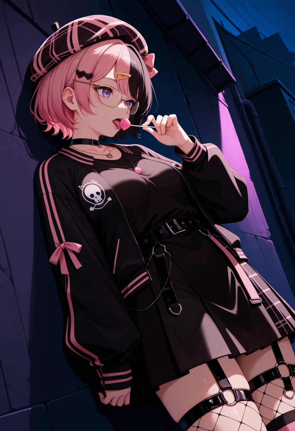 Hinan0Pun, purple eyes, multicolored hair, pink hair, black hair, short hair, plaid beret, hat bow, hairclip, glasses, black choker, necklace, black jacket, black shirt, black belt, black skirt, asymmetrical legwear, thigh strap, fishnet thighhigh, striped thighhighs