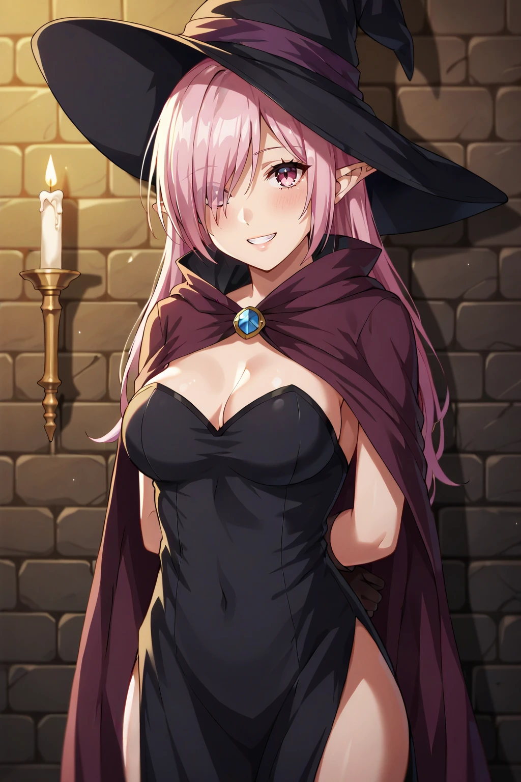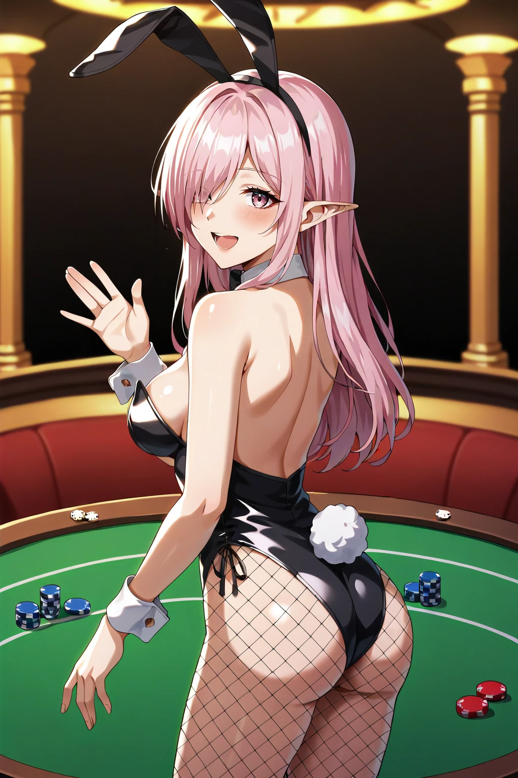 KJOsonia, pink hair, dark pink eyes, long hair, pointy ears, hair over one eye,