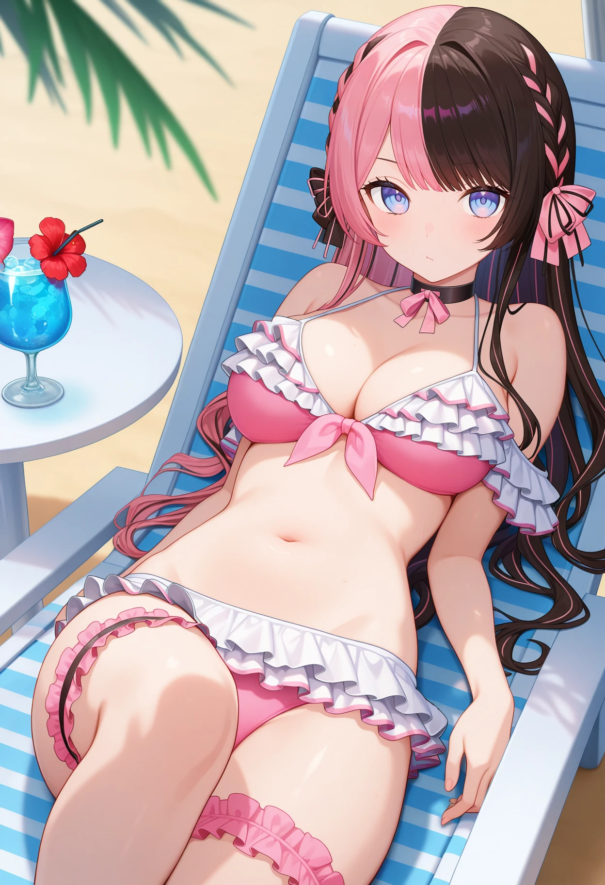 outfit5aahinano, long hair, multicolored hair, braid, hair bow, blue eyes, ribbon choker, bare shoulders, frilled bikini, pink bikini, bikini skirt, bridal garter