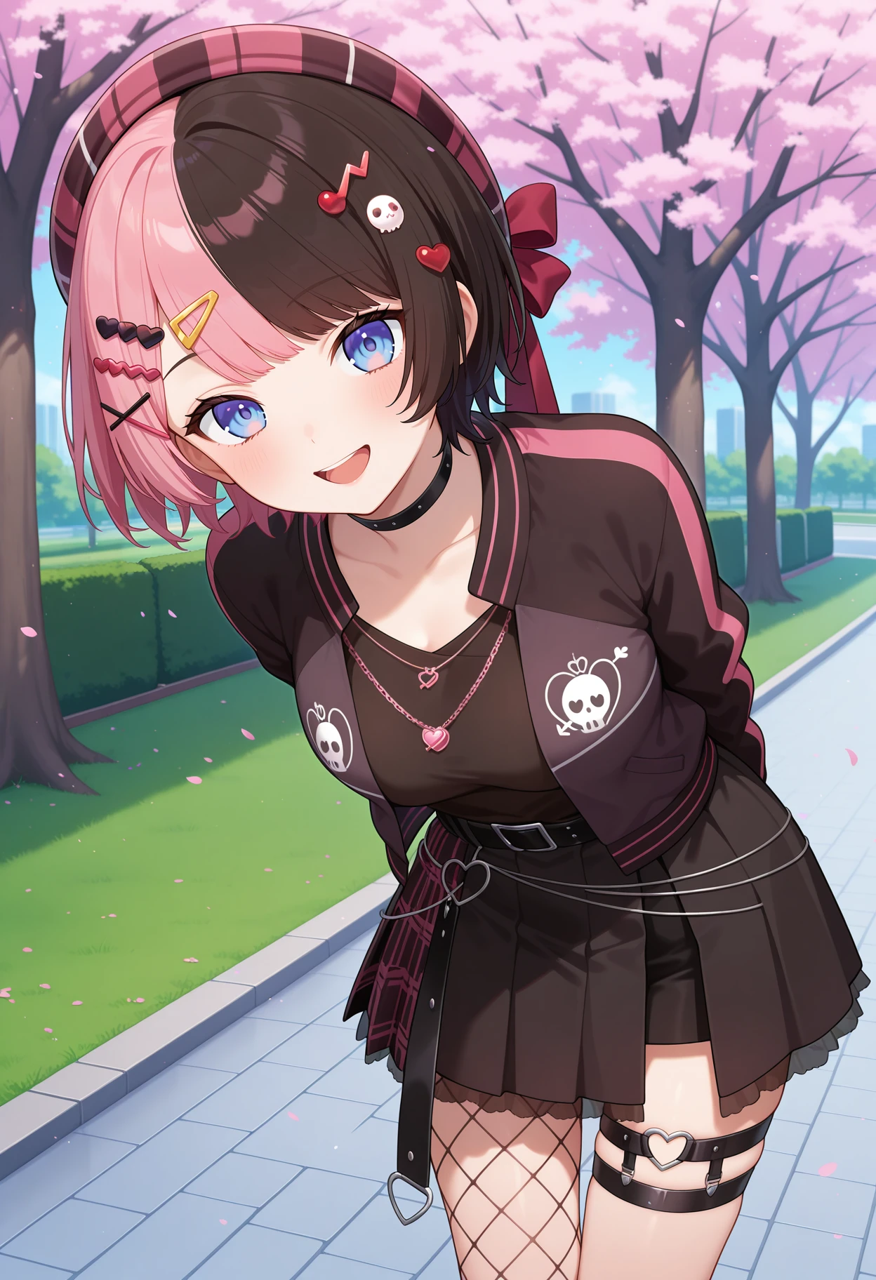 outfit3cchinano, short hair, multicolored hair, beret, plaid headwear, hat bow, hair ornament, hairclip, blue eyes, black choker, necklace, black shirt, black jacket, long sleeves, black belt, overskirt, black skirt, thigh strap, legwear garter, single leg pantyhose, fishnet pantyhose