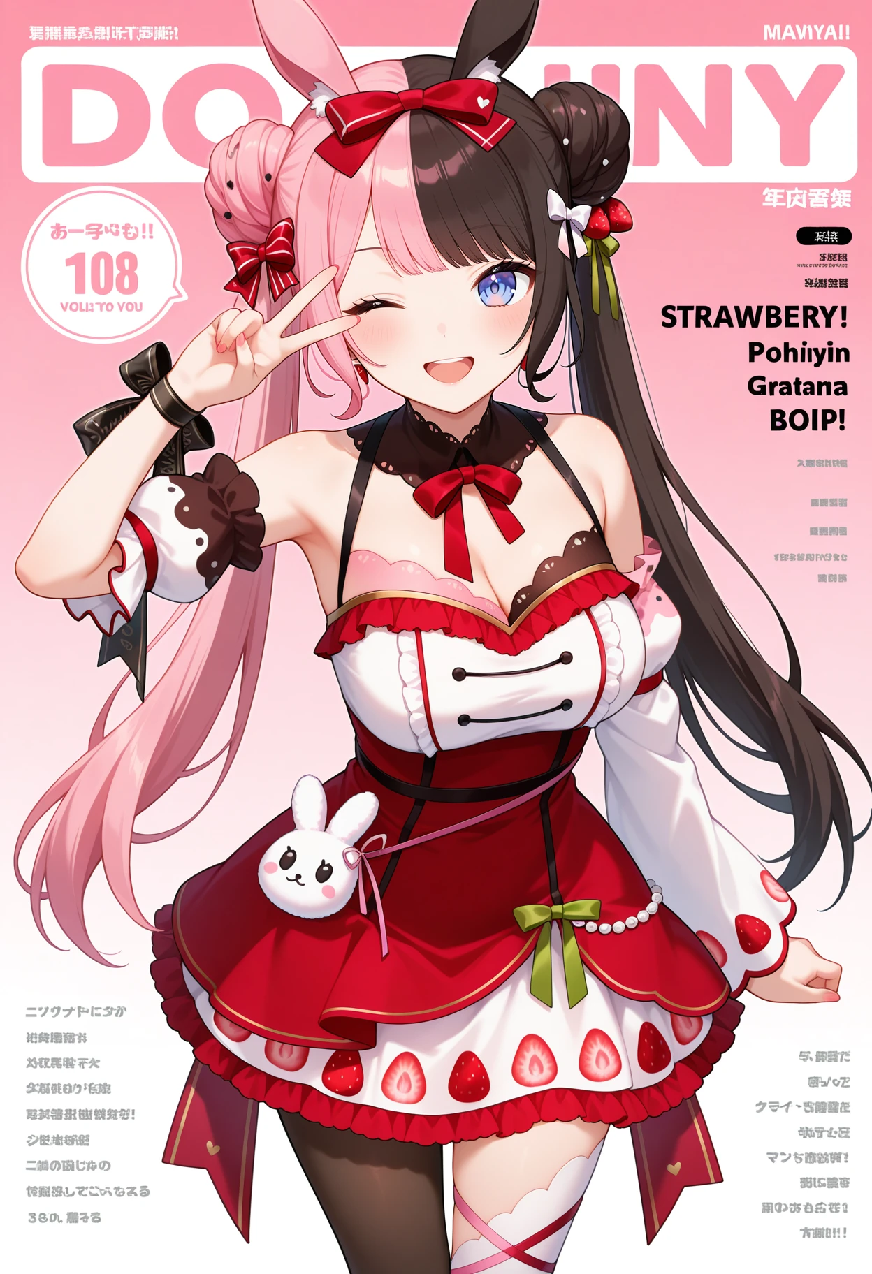 outfit4ddhinano, long hair, multicolored hair, double bun, twintails, animal ears, hair bow, blue eyes, detached collar, strawberry print, red bowtie, white dress, red dress, detached sleeves, wrist bow, animal bag, single thighhigh, white thighhighs, single leg pantyhose, black pantyhose