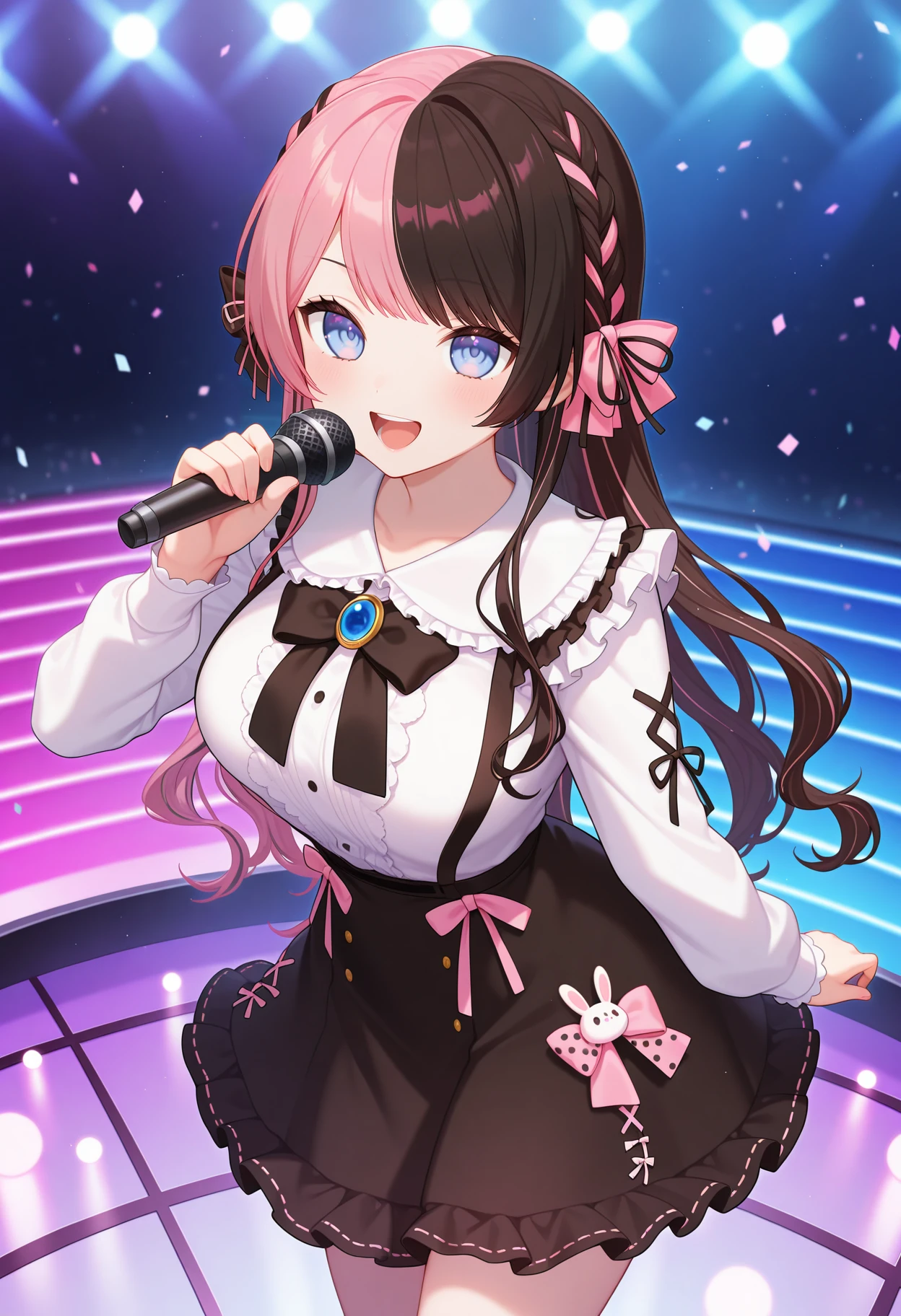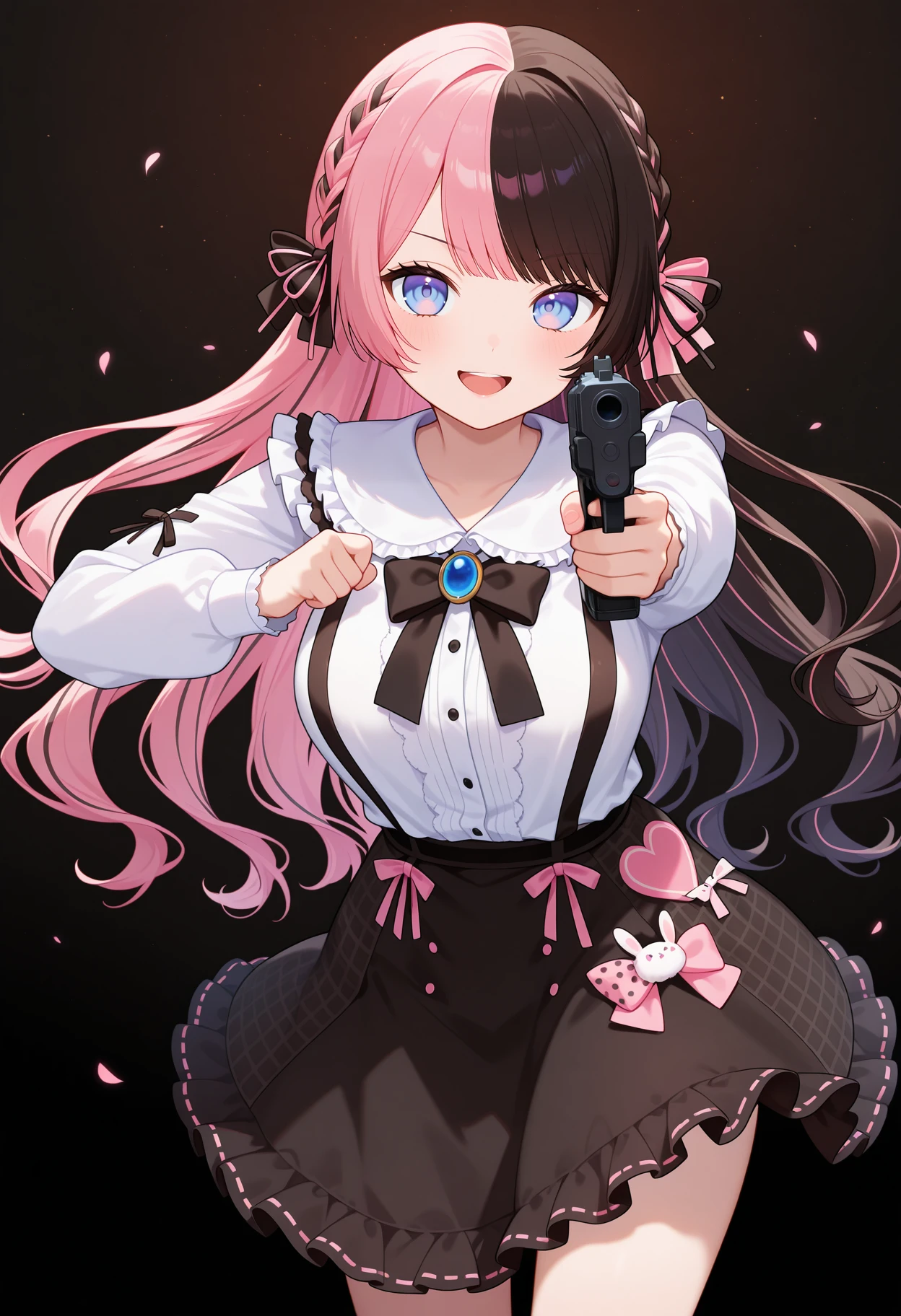 outfit1aahinano, long hair, multicolored hair, braid, hair bow, blue eyes, frills, black bowtie, brooch, white shirt, long sleeves, suspenders, black skirt, pink bow