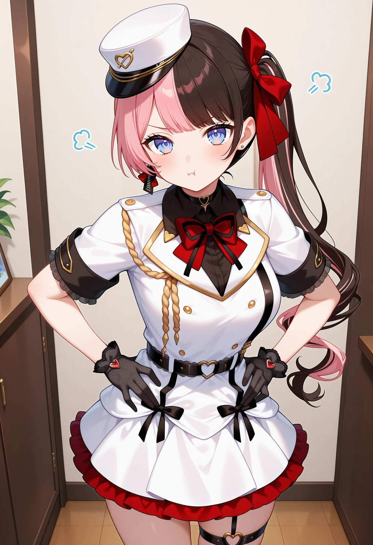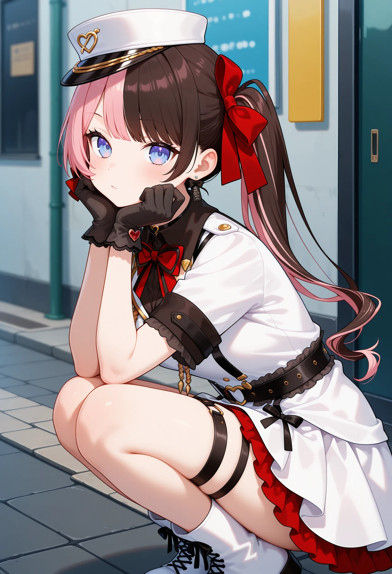 outfit2bbhinano, long hair, multicolored hair, side ponytail, hair bow, peaked cap, white headwear, earrings, blue eyes, red bowtie, black shirt, white dress, white jacket, short sleeves, black gloves, black belt, thigh strap