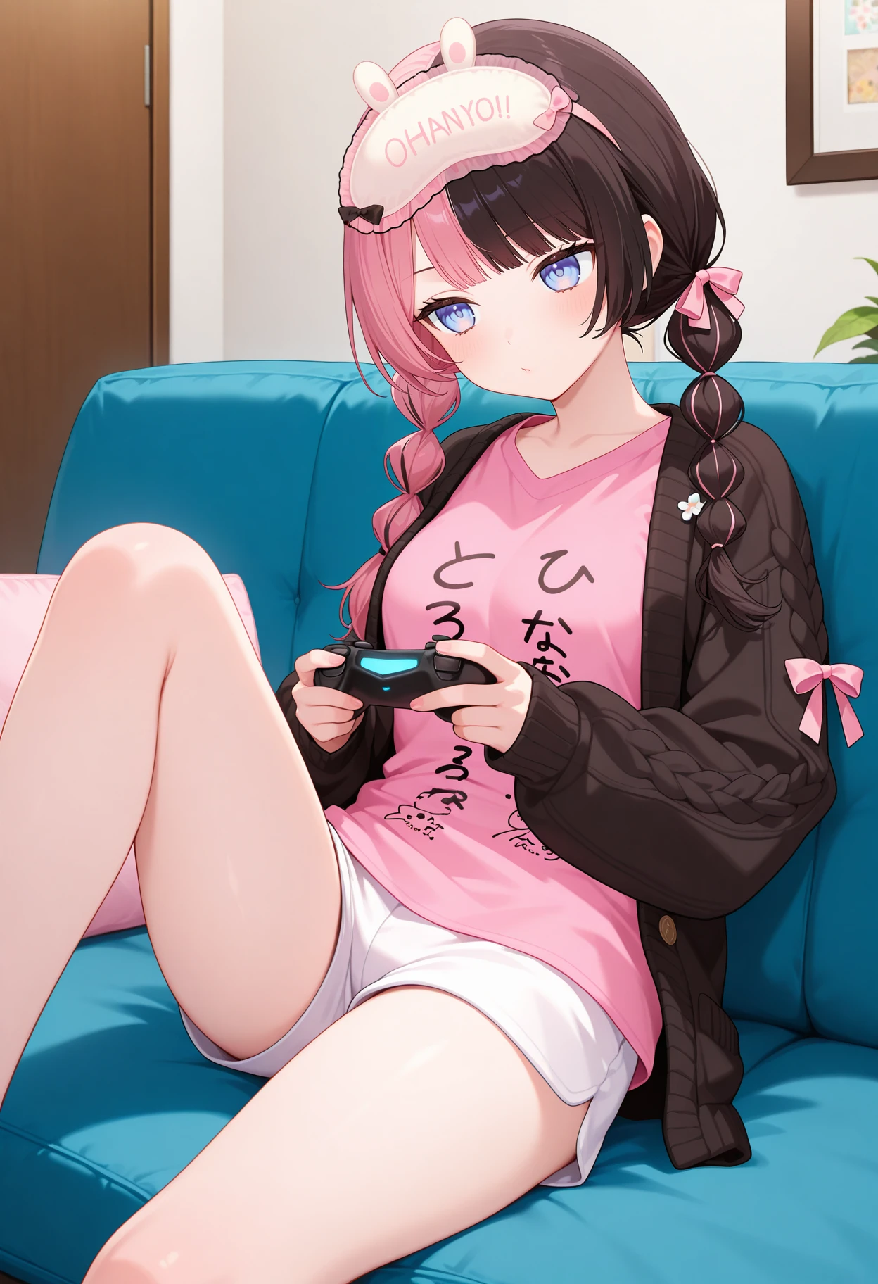 outfit7-1ffhinano, long hair, multicolored hair, twin braids, mask on head, sleep mask, blue eyes, pink shirt, clothes writing, black cardigan, long sleeves, short shorts, white shorts