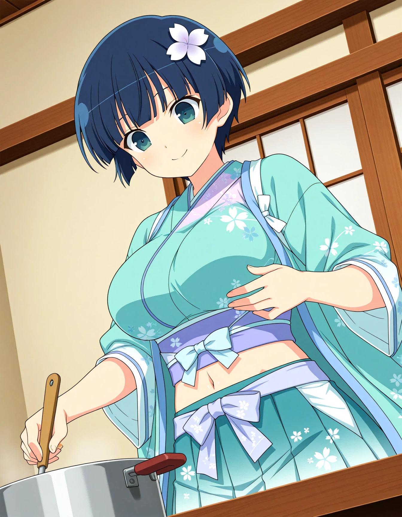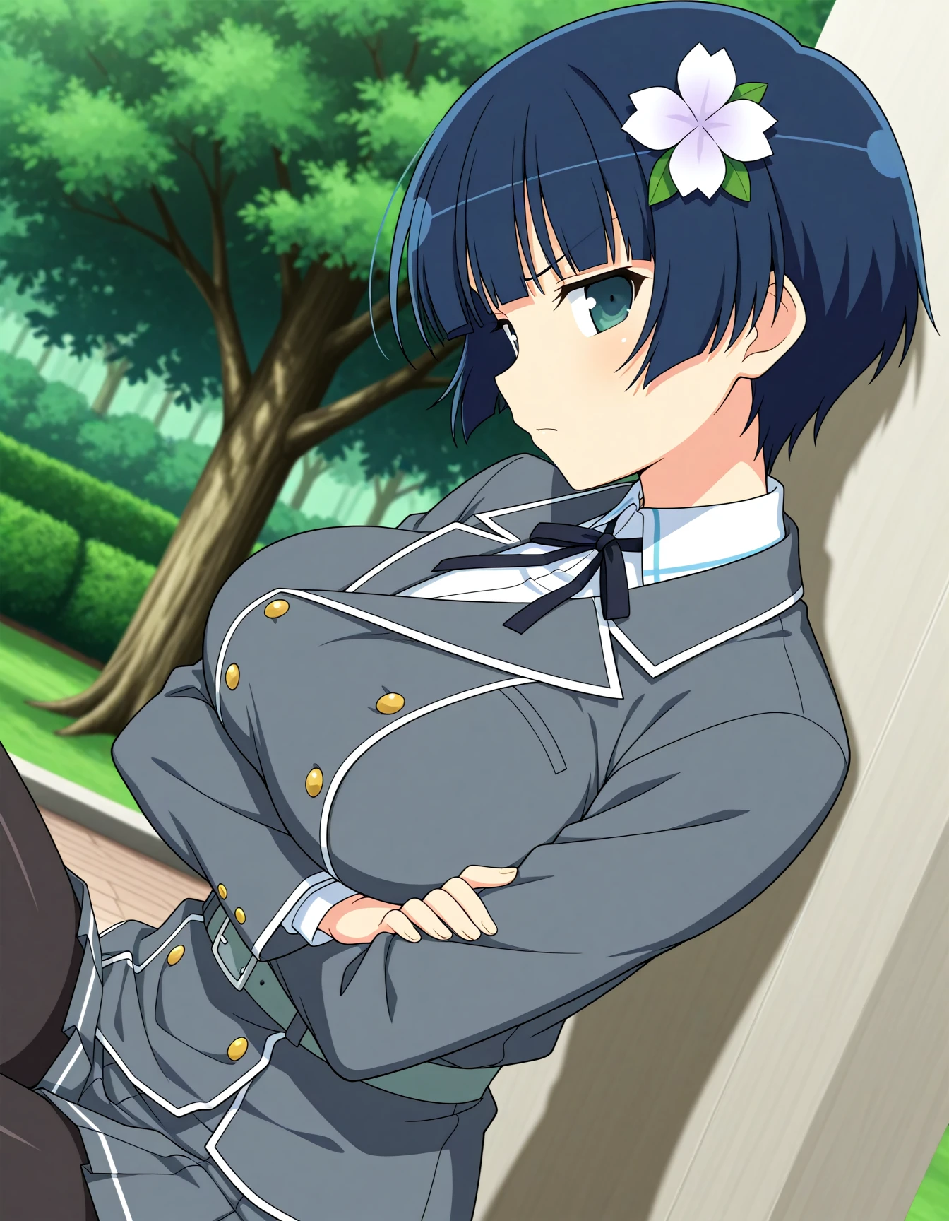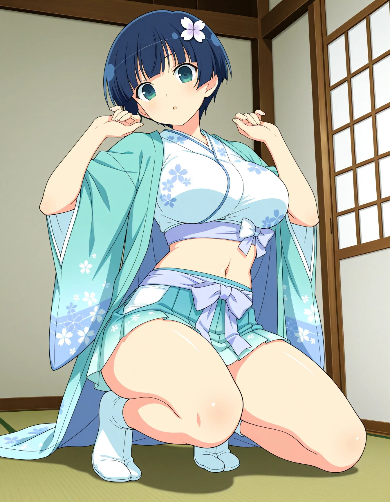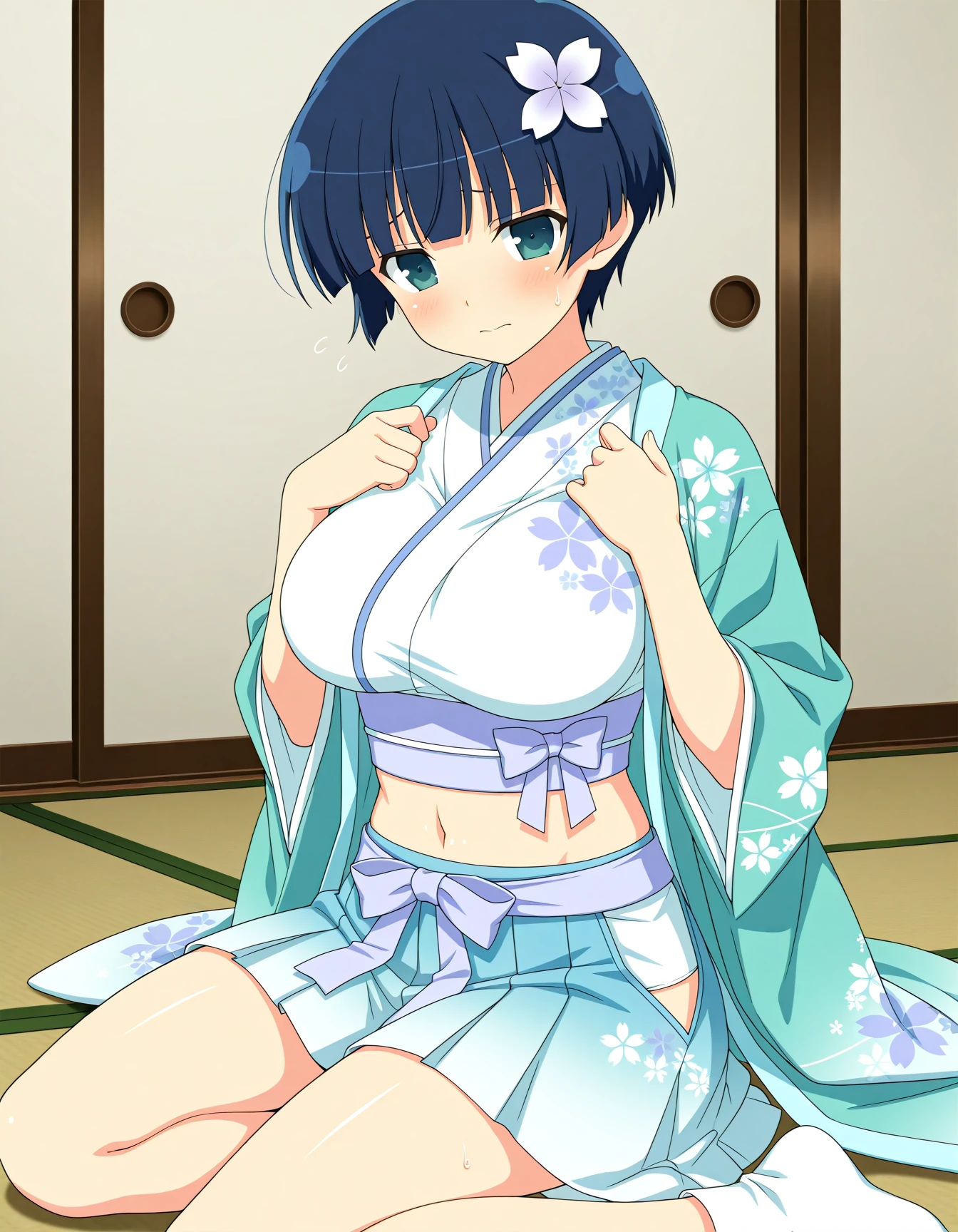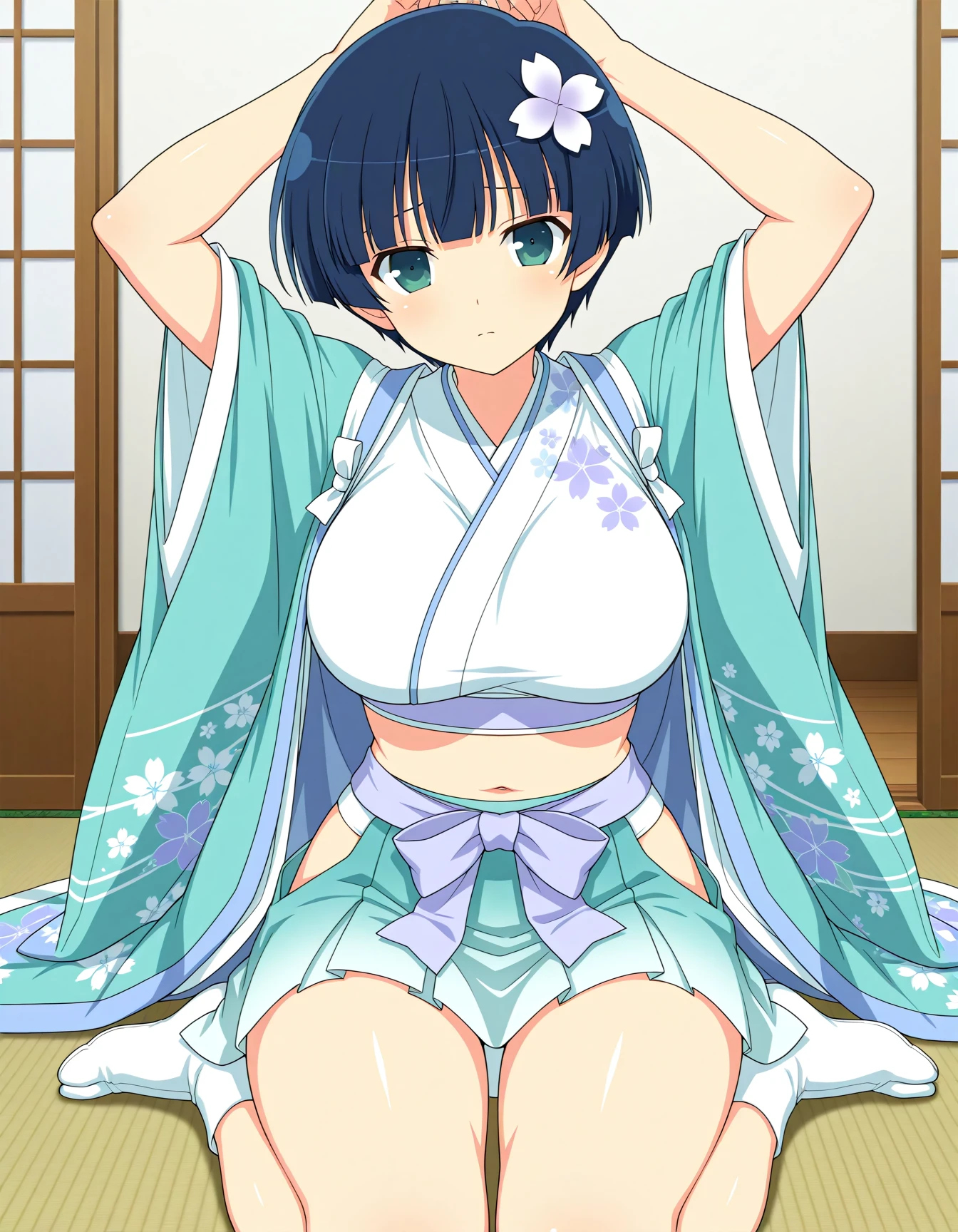 yozakura \(senran kagura\),blue-green eyes,dark blue hair,short hair,hair flower ornament,large breasts,