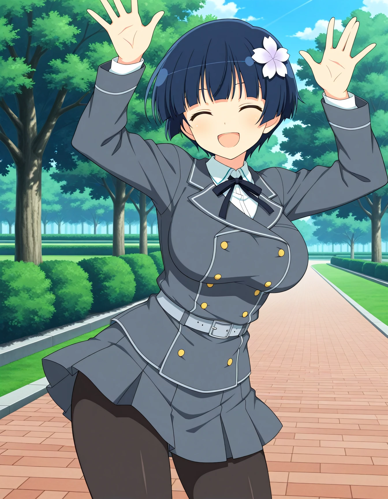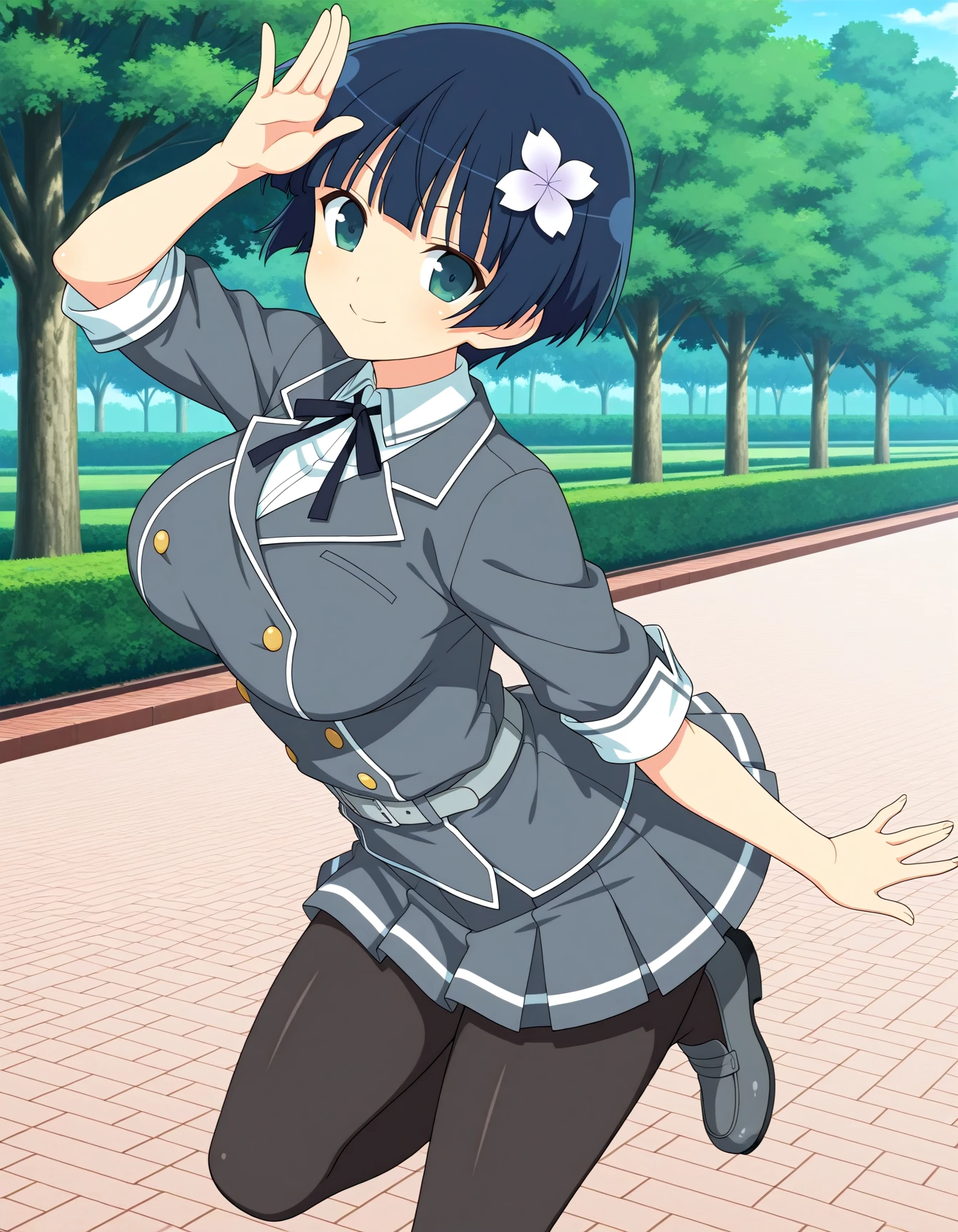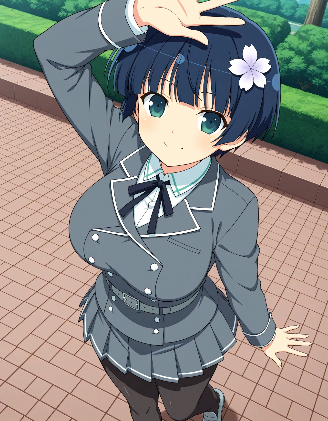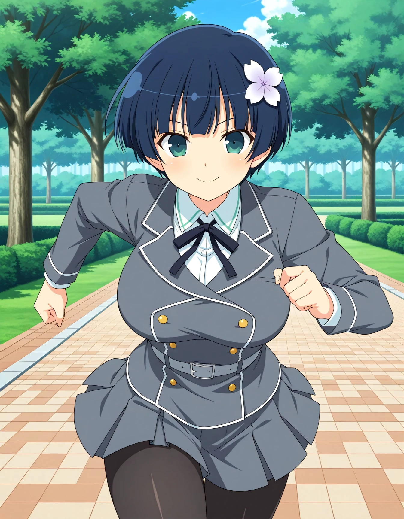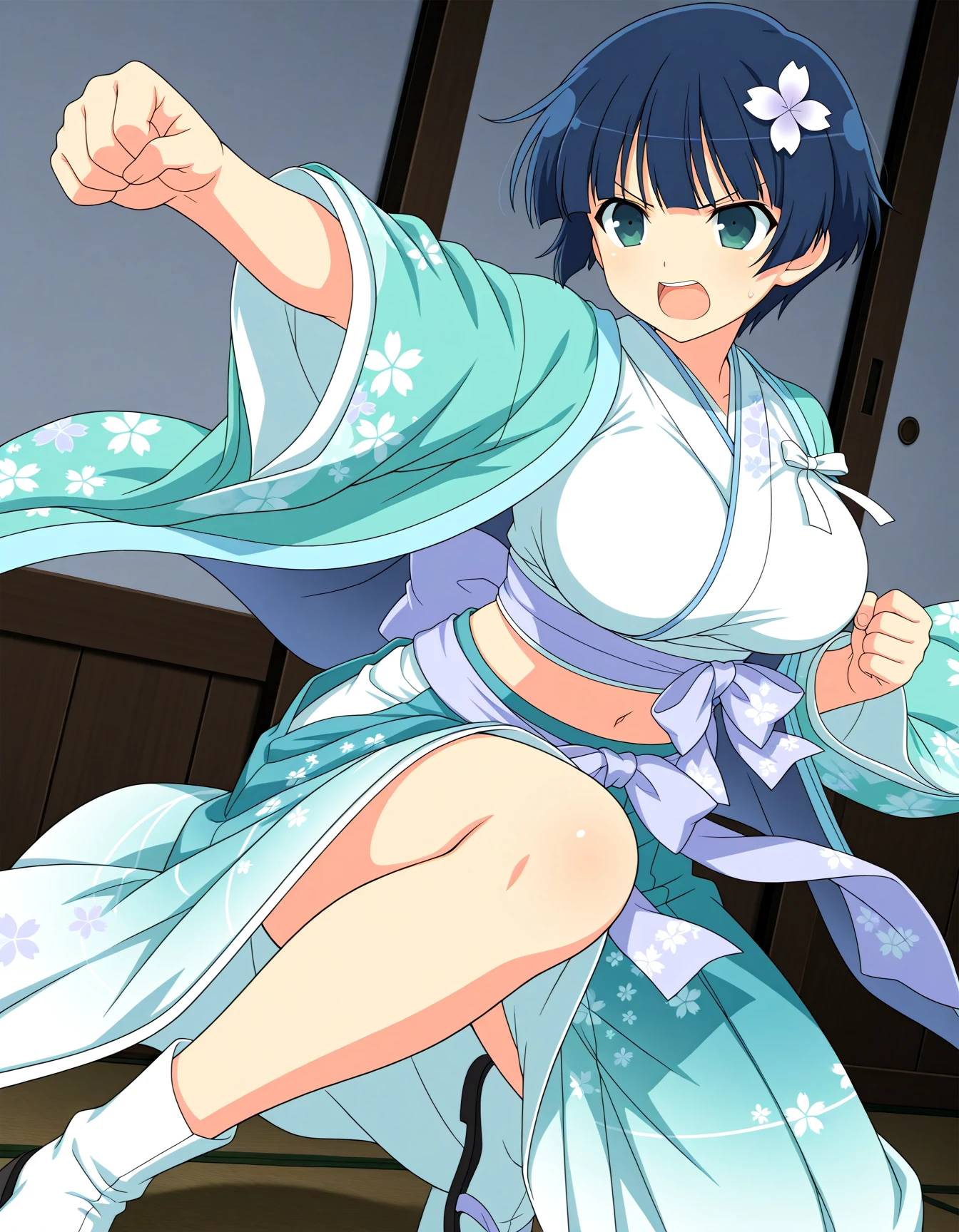 yozakura \(senran kagura\),blue-green eyes,dark blue hair,short hair,hair flower ornament,large breasts,