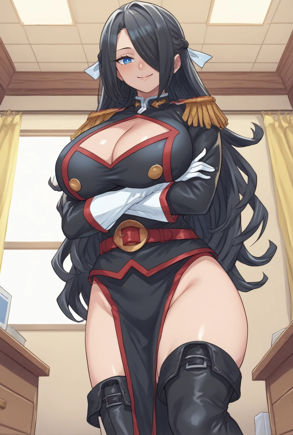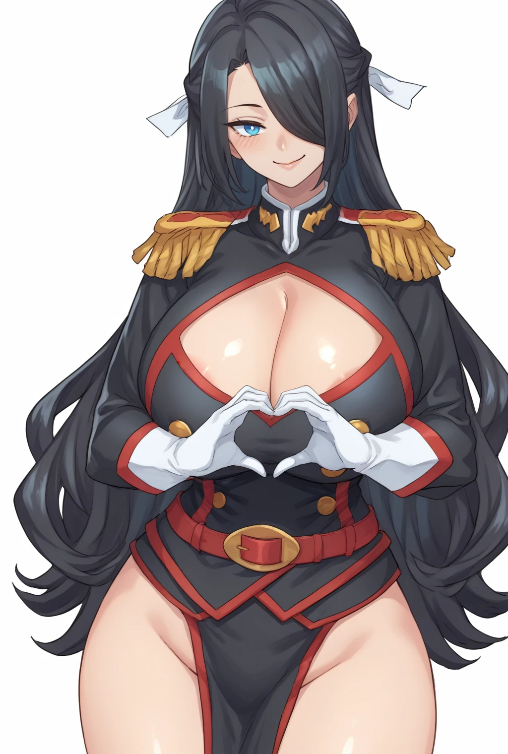 FubukiAzuma, long hair, black hair, hair over one eye, blue eyes, black dress, military uniform,red trim, double-breasted, cleavage cutout, red belt, pelvic curtain, epaulettes, long sleeves, white gloves, elbow gloves, hair ribbon, white ribbon