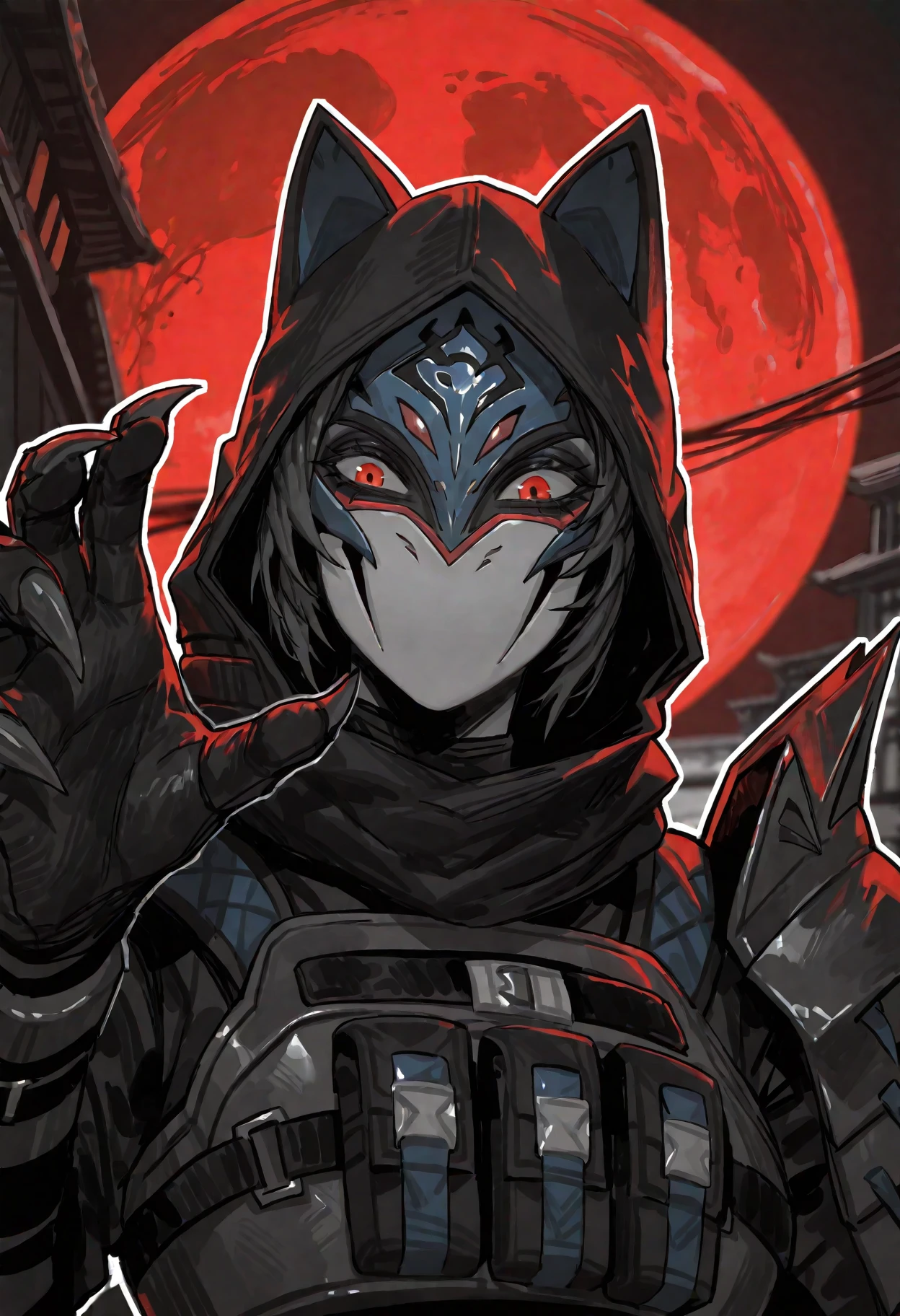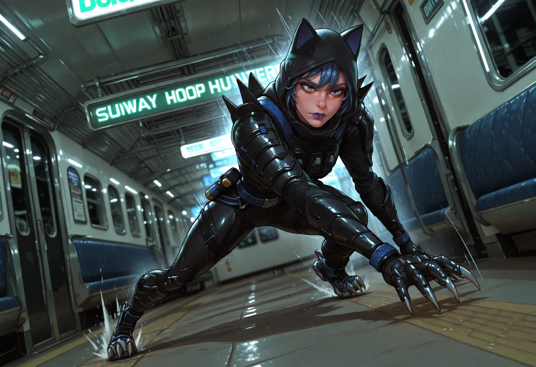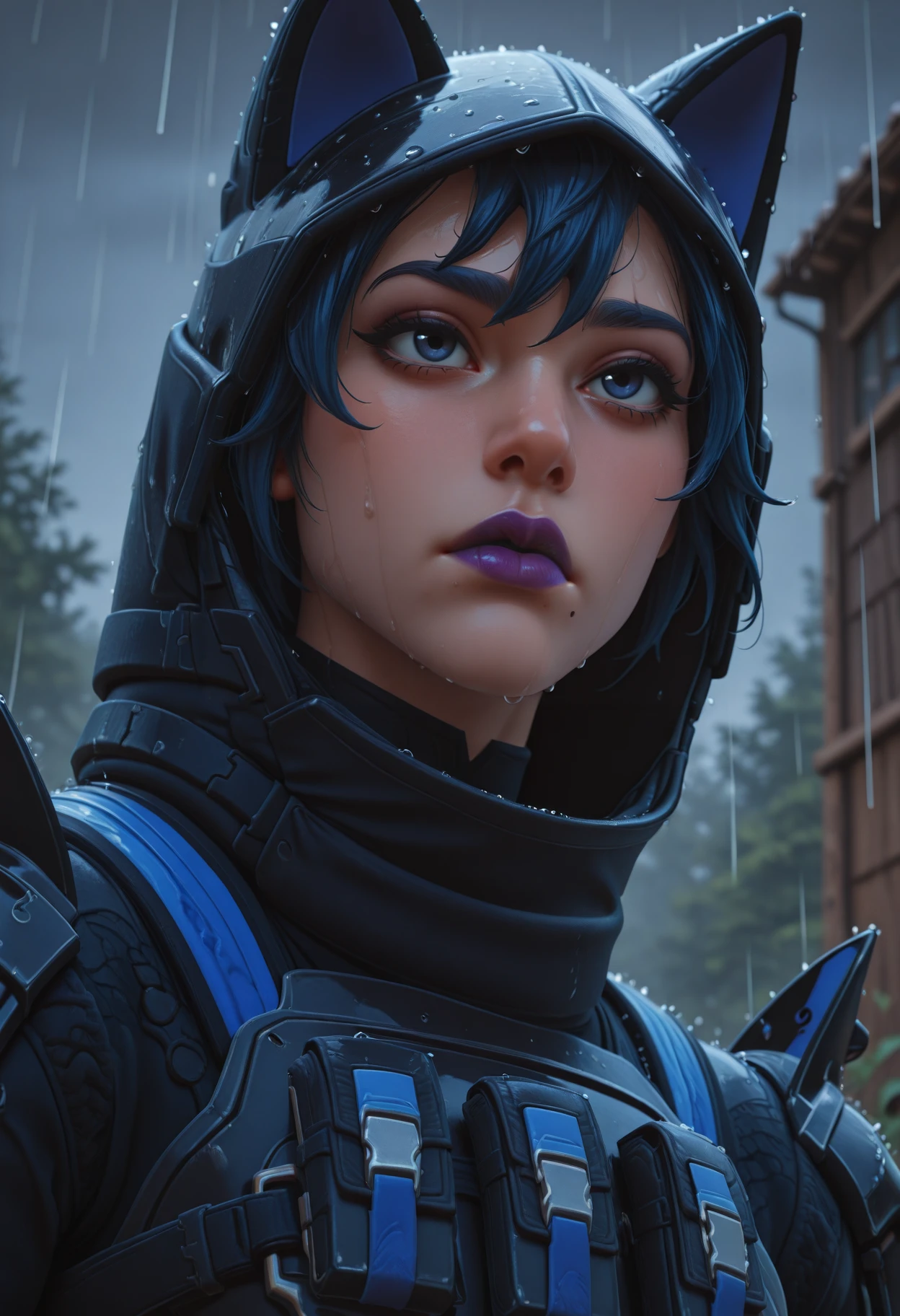 Of course, if you prompted her with her mask or her hood on then don't use any of the face/head descriptors like "purple lips" or "headband" etc.
