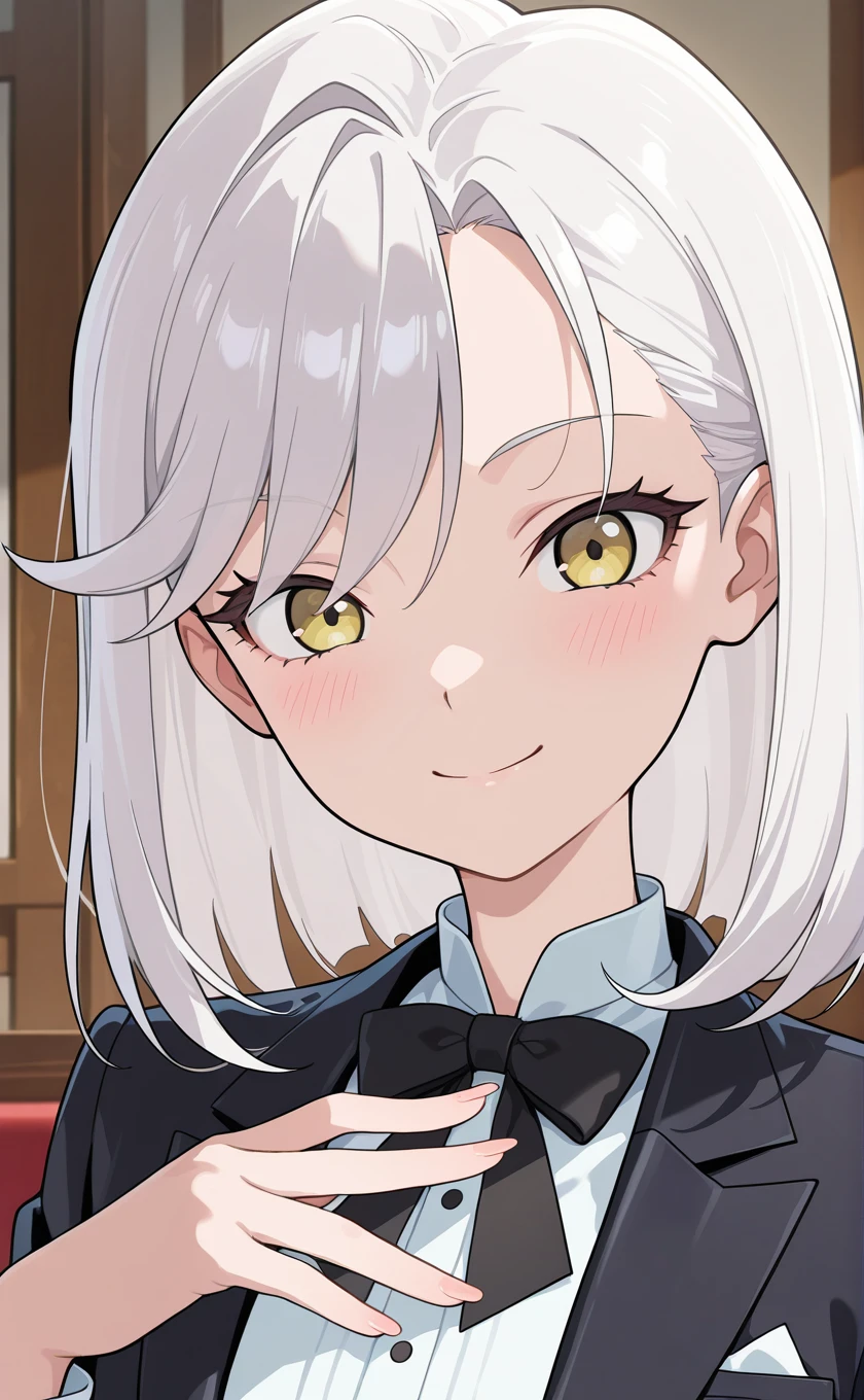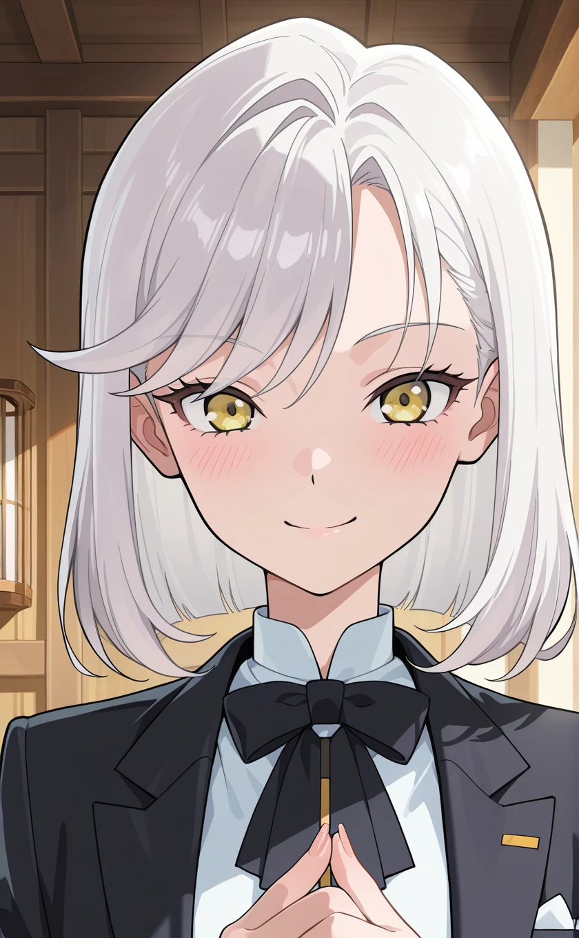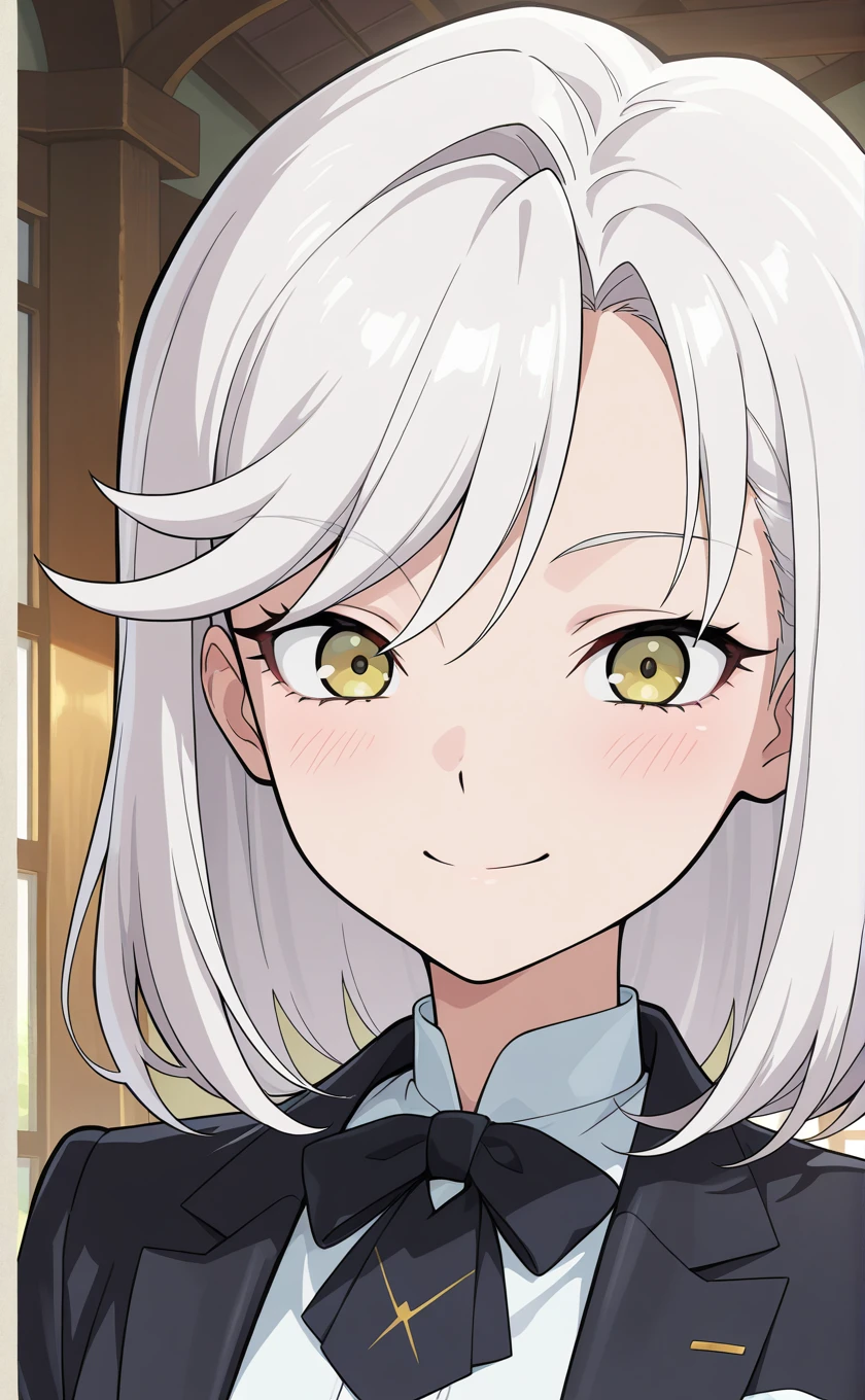 medium hair,white hair,swept bangs,yellow eyes