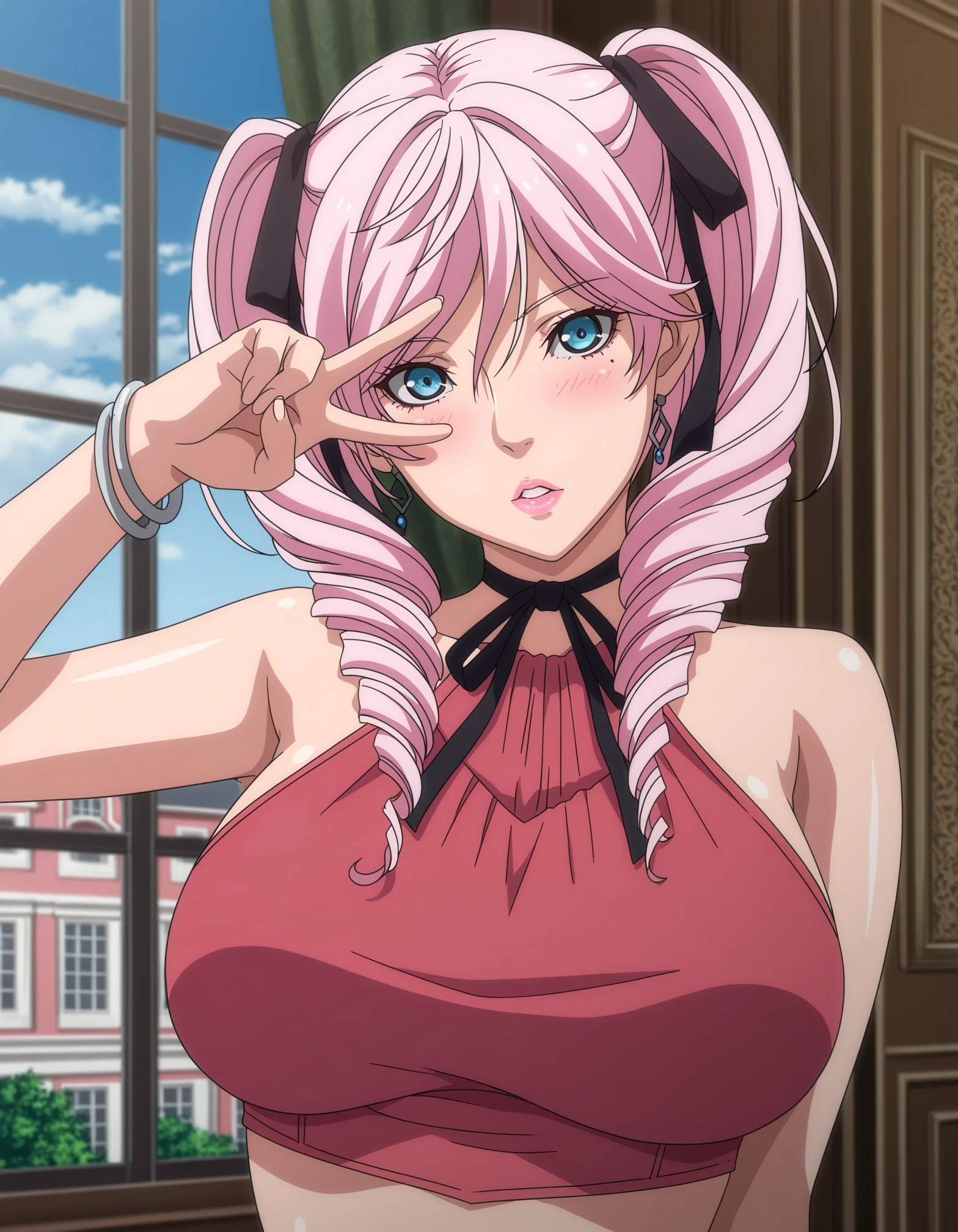 mamiya maria, 1girl, pink hair, blue eyes, twin drills, pink lips, ribbon choker, hair ribbon, mole under eye,