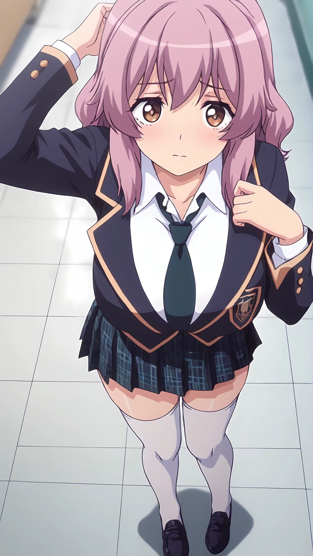 Kamisuura risa,1girl,solo,thighhighs,skirt,school uniform,pink hair,white thighhighs,breasts,large breasts,zettai ryouiki,brown eyes,plaid,jacket,plaid skirt,necktie,blazer,shoes,pleated skirt,
