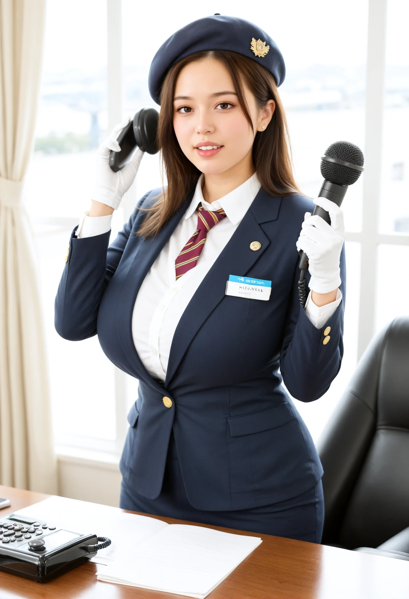 >busguide, gloves, hat, white gloves, male focus, 1boy, holding, cup, phone, microphone, uniform, necktie, window, realistic, shirt, brown hair, black jacket, radio, open mouth, curtains, corded phone, indoors, white shirt, jacket, long sleeves, collared shirt, solo, beret, striped necktie ,