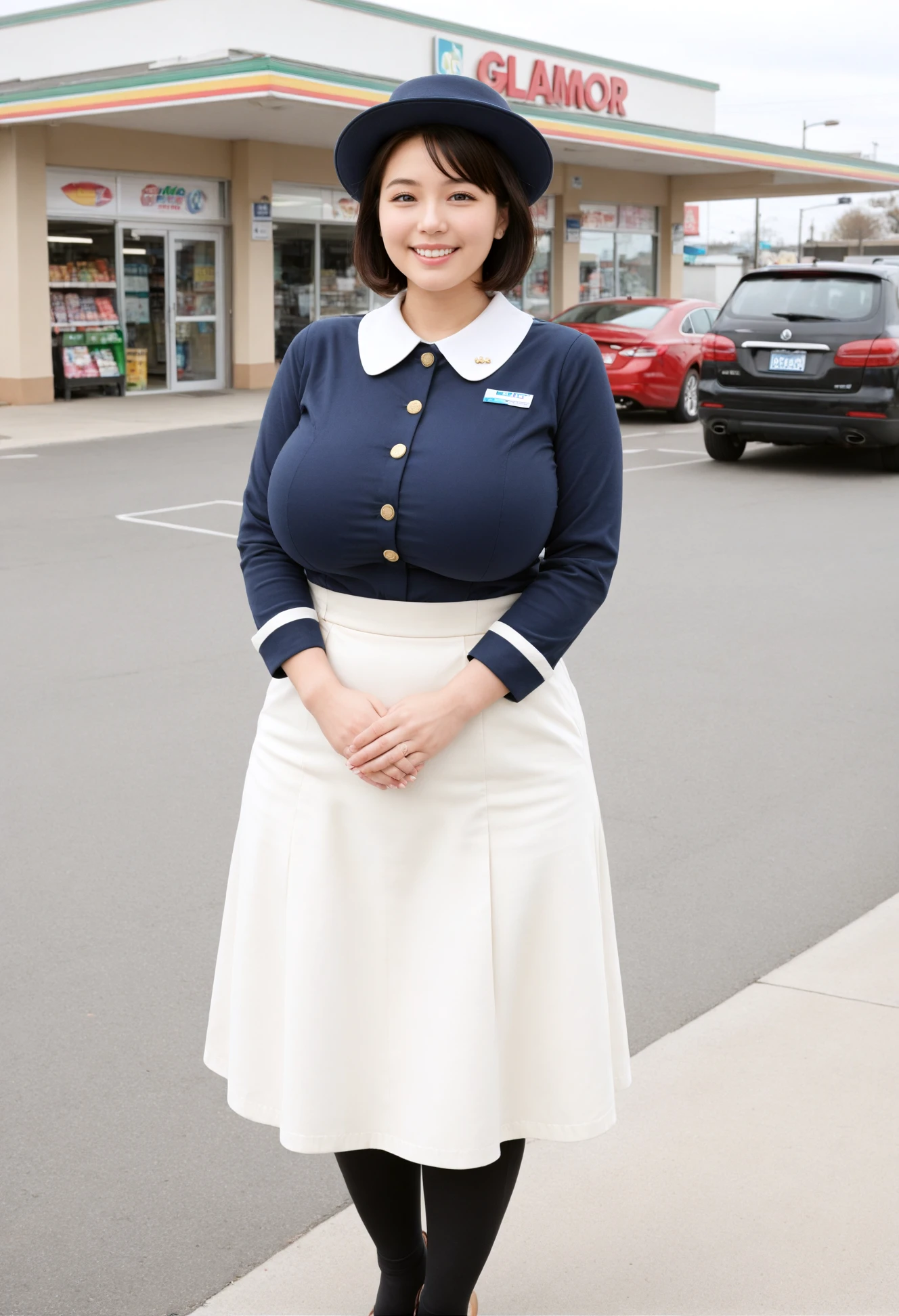 busguide, 1girl, ground vehicle, motor vehicle, car, smile, black hair, outdoors, hat, solo, own hands together, convenience store, bird, shop, standing, open mouth, short hair,