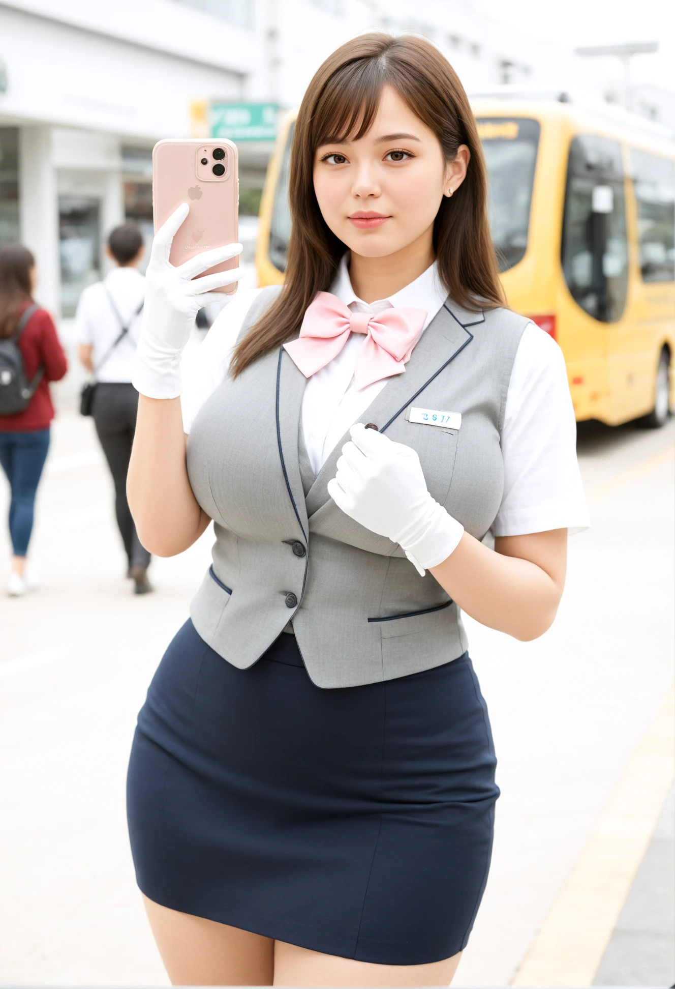 Trigger words: busguide, gloves, phone, white gloves, 1girl, skirt, cellphone, vest, brown hair, holding, holding phone, pink bow, brown eyes, shirt, mirror, smartphone, solo focus,