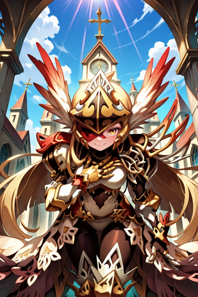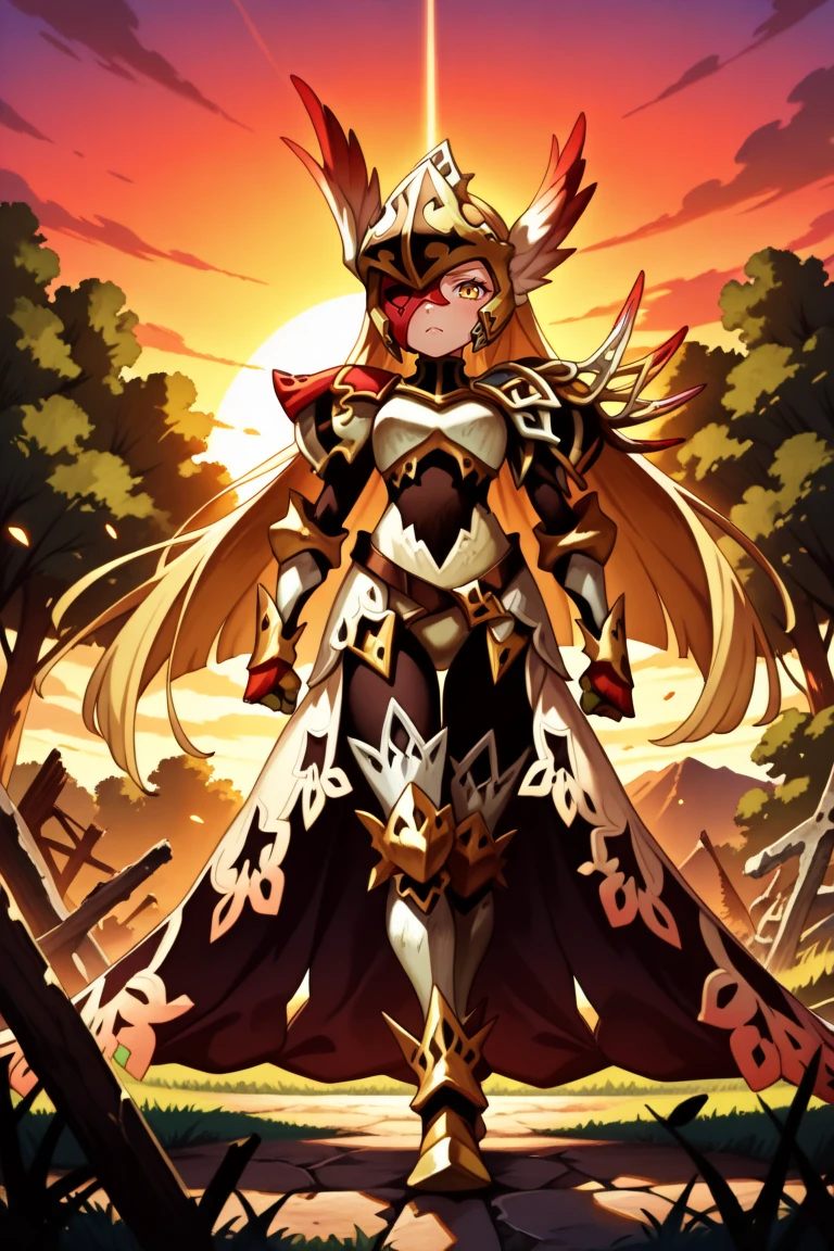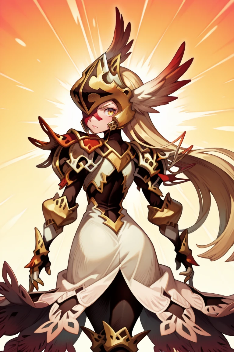 mriadef, 1girl, blonde hair, long hair, one eye covered, yellow eye, red eyepatch, winged helmet, asymmetrical armor, single pauldron, shoulder spikes, lace-trimmed skirt, gauntlets, greaves, black leggings, high heels
