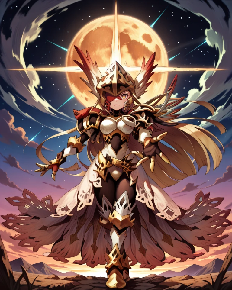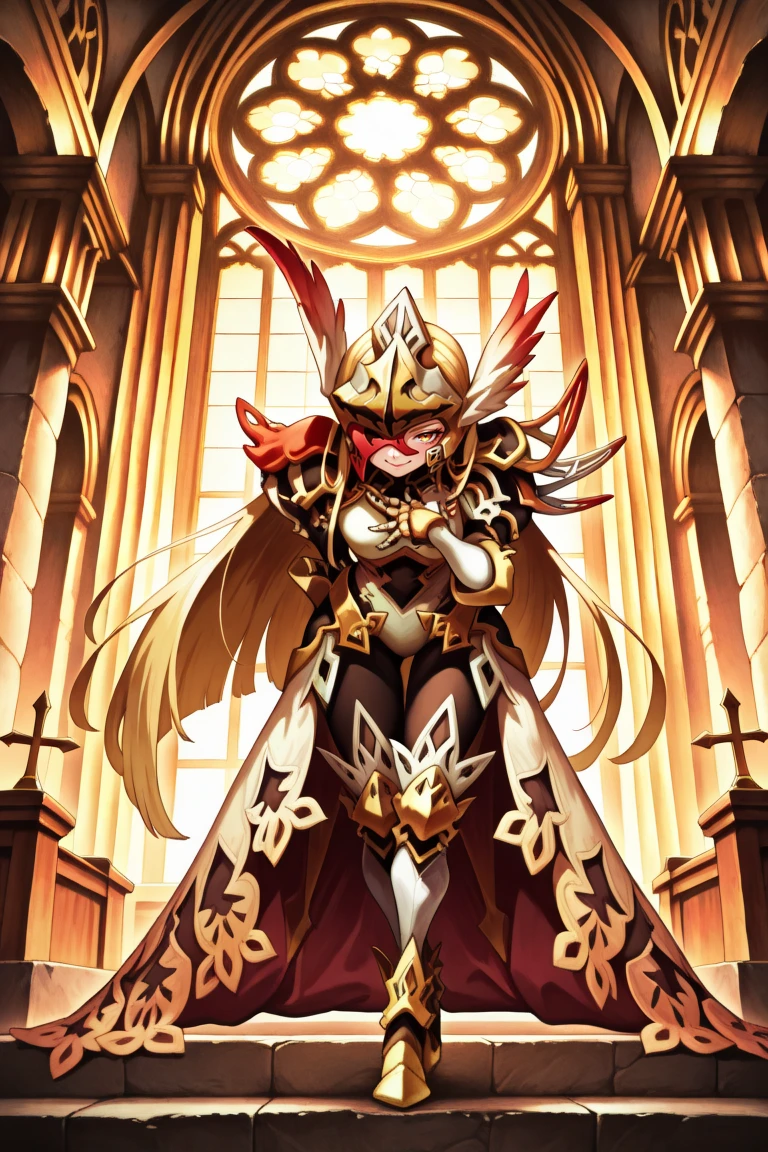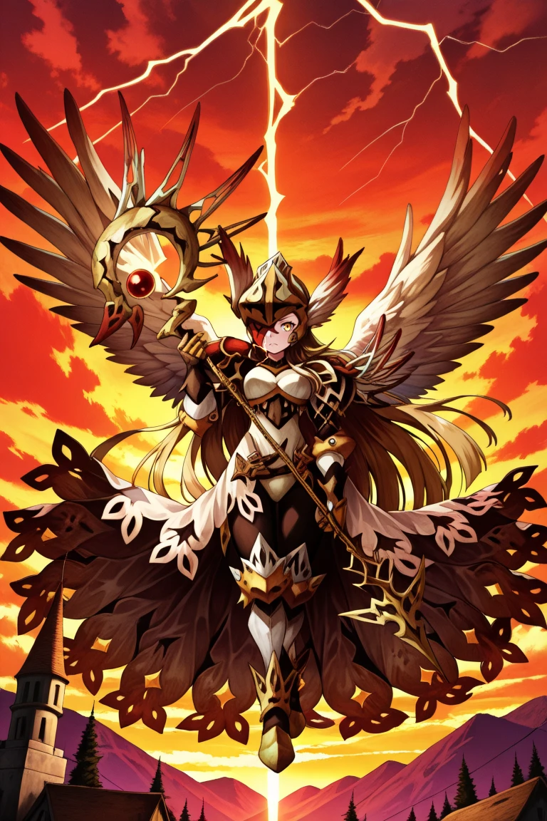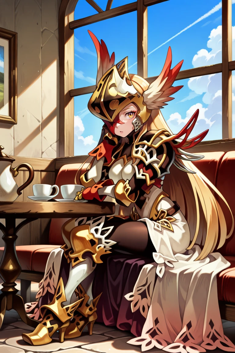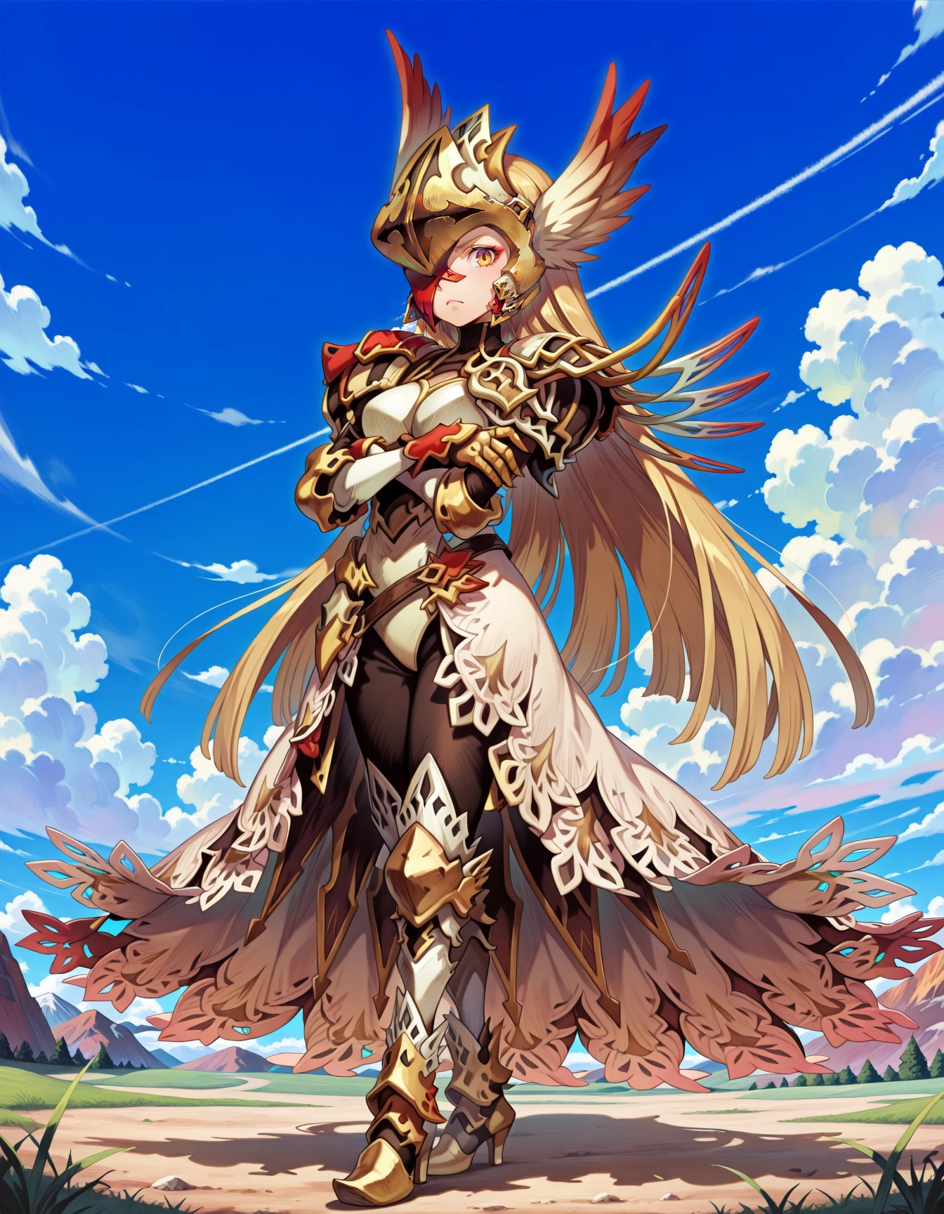 Helpful Tags: 1girl, blonde hair, long hair, one eye covered, yellow eye, red eyepatch, winged helmet, asymmetrical armor, single pauldron, shoulder spikes, lace-trimmed skirt, gauntlets, greaves, black leggings, high heels