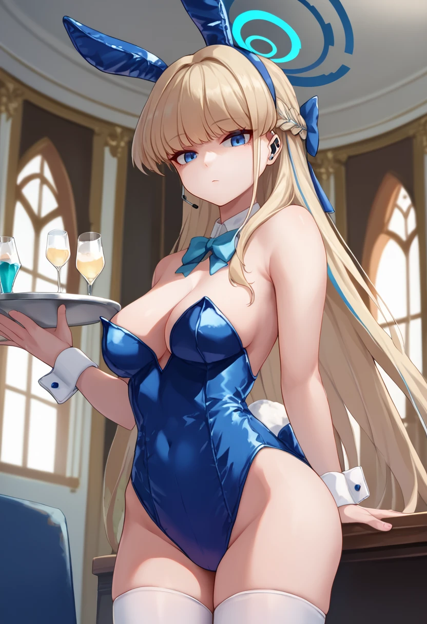 tokibunny, long hair, streaked hair, braid, blue hairband, earpiece, blue halo, playboy bunny, blue leotard, strapless leotard, highleg leotard, detached collar, blue bow, white wrist cuffs, white thighhighs, fake tail, rabbit tail, bare shoulders, cleavage