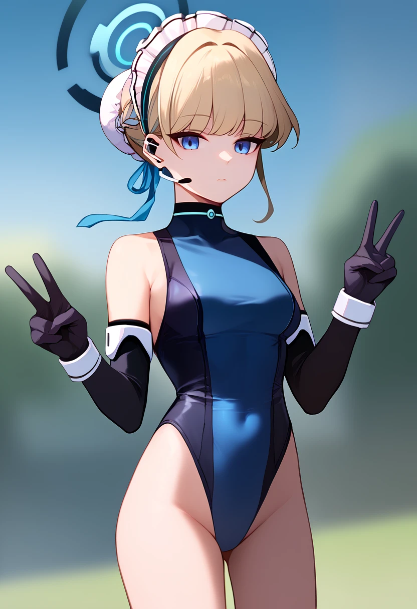 Leotard: tokileotard, short hair, single hair bun, bun cover, braid, hair ribbon, blue ribbon, maid headdress, earpiece, blue halo, two-tone leotard, blue leotard, black leotard, highleg leotard, sleeveless turtleneck leotard, black gloves, elbow gloves