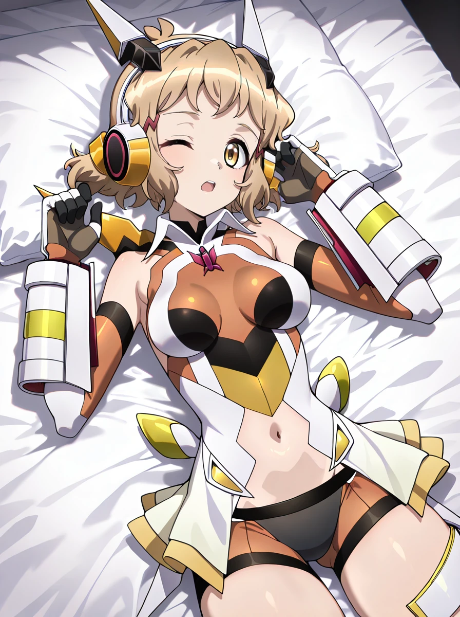 Prompts: 1girl, solo, short hair, brown hair, brown eyes scarf, headgear, navel, headphones, bodysuit, medium breasts, gauntlets,, hair ornament