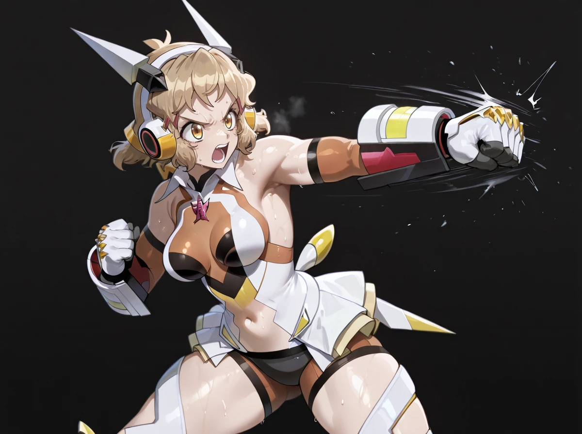 Prompts: 1girl, solo, short hair, gloves, gauntlets, breasts, headgear, headphones, medium breasts, brown eyes, hairclip, leotard , boots navel cutout, symphogear pendant , elbow gloves, gloves