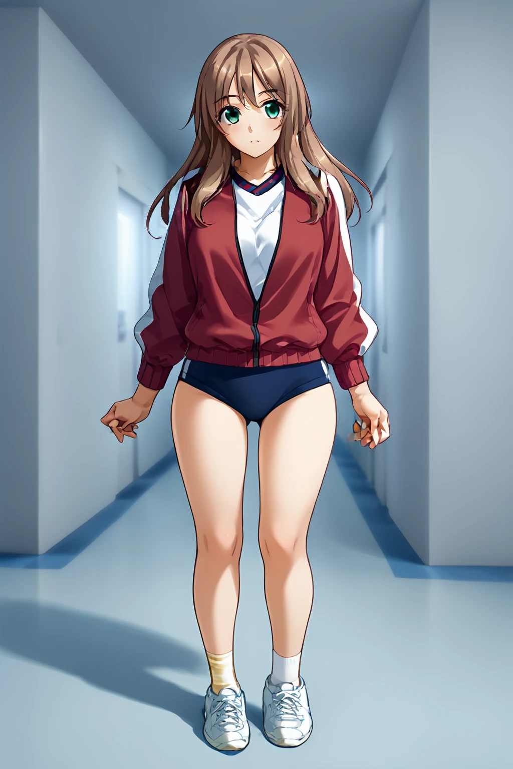 socks,sneakers, gym uniform, red track jacket, blue buruma,open jacket,