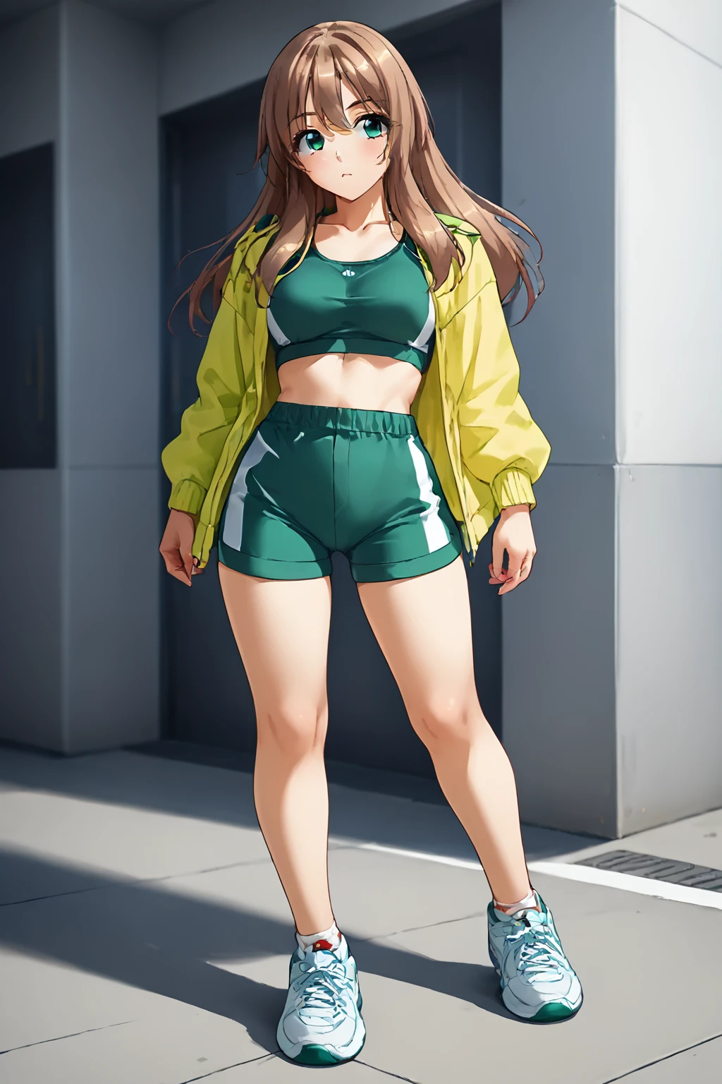 jacket, open clothes, shoes, shorts, open jacket, green crop top, shorts, sneakers, sports bra, green shorts,