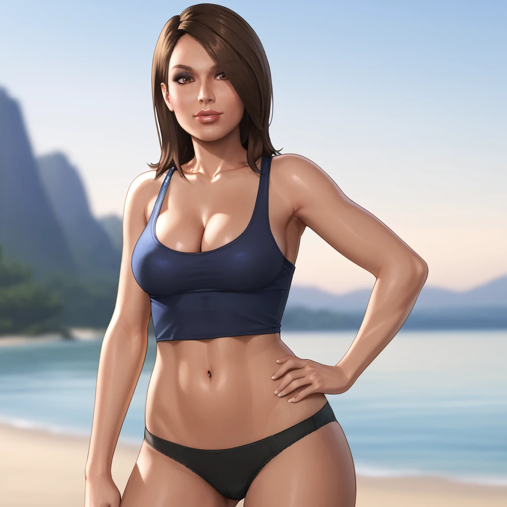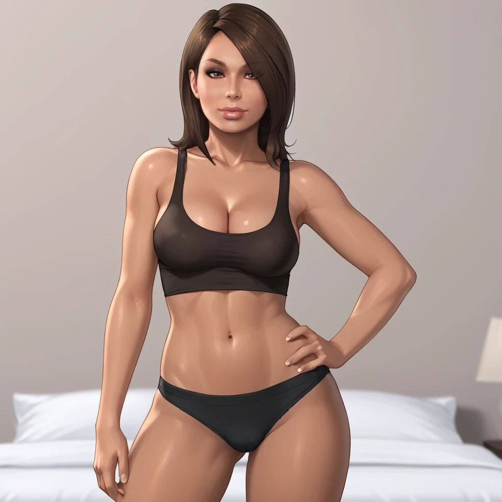 • Trigger with tank top: AshleyMassEffect, 1girl, solo, medium breasts, underwear, black panties, cleavage, tank top, brown hair, hair over one eye, brown eyes, dark skin, dark-skinned female, midriff, lips, navel, cowboy shot